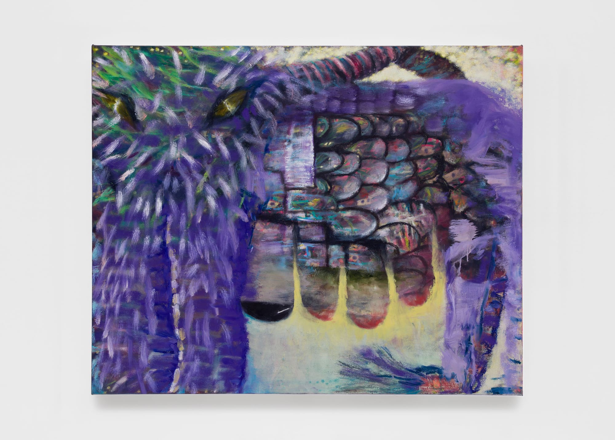 This uncertainty is at the heart of Yim’s art. With its long, red, yarn-like tresses, the one-eyed creature in “Howl” (2023) is essentially unreadable. Is it friendly or treacherous? Yet the artist counteracts the terror through her colors and the evocation of soft forms. Her use of color, which is only hinted at in the Quarantine Drawings, is on full display in this exhibition. Purple dominates in “Sheep Wolf” (2023), which I see as her re-envisioning of Jackson Pollock’s “The She-Wolf” (1943). According to Roman mythology, a wolf suckled the twins Romulus and Remus. Later, in a dispute, Romulus killed Remus and founded Rome. In ancient Rome, purple designated someone’s status as royalty, suggesting that the wolf is royalty in the painting, not the twins. At the same time, it is unclear whether the creature is friendly or ferocious. This is what makes the paintings so strong. Just as they hold our attention with their merging of color and form, we are left questioning their meaning.