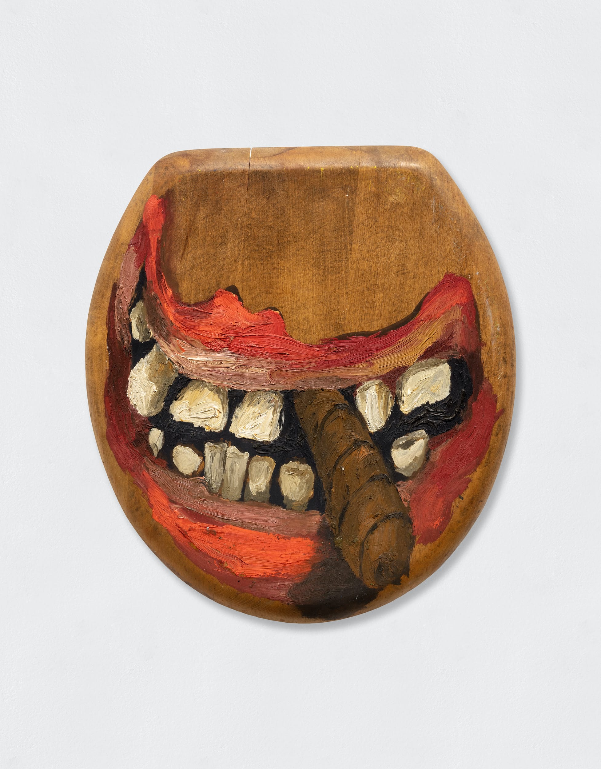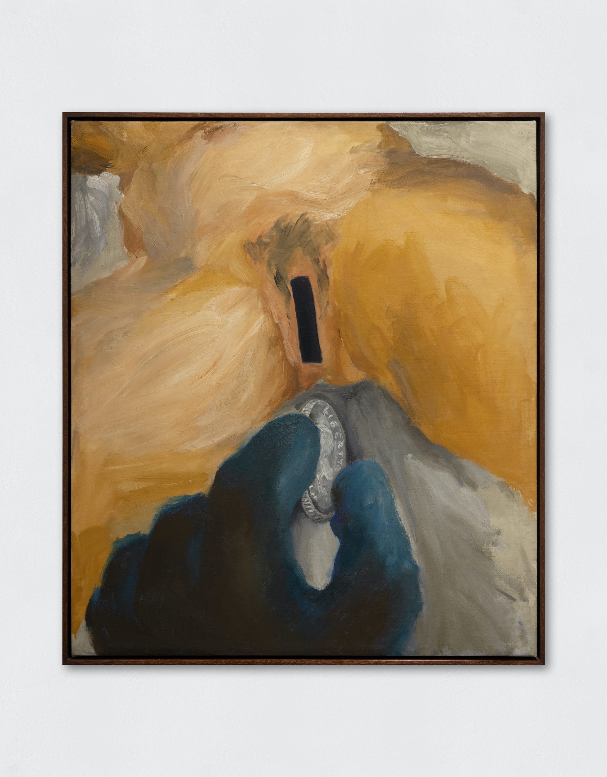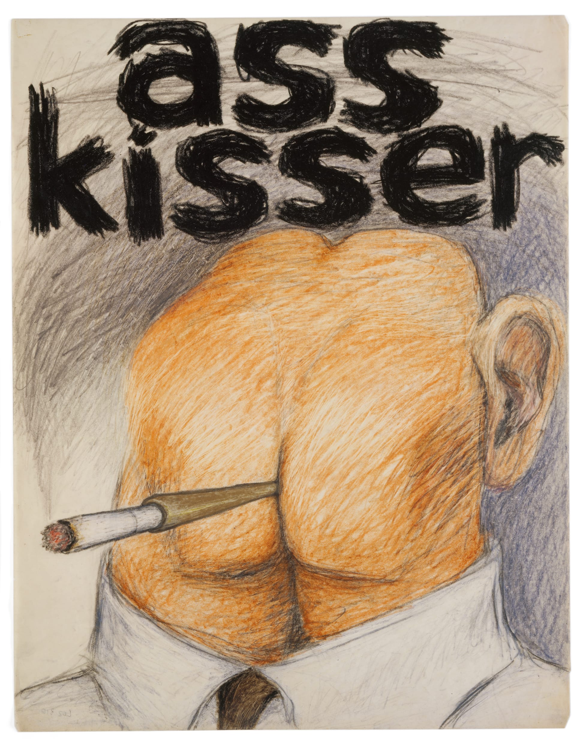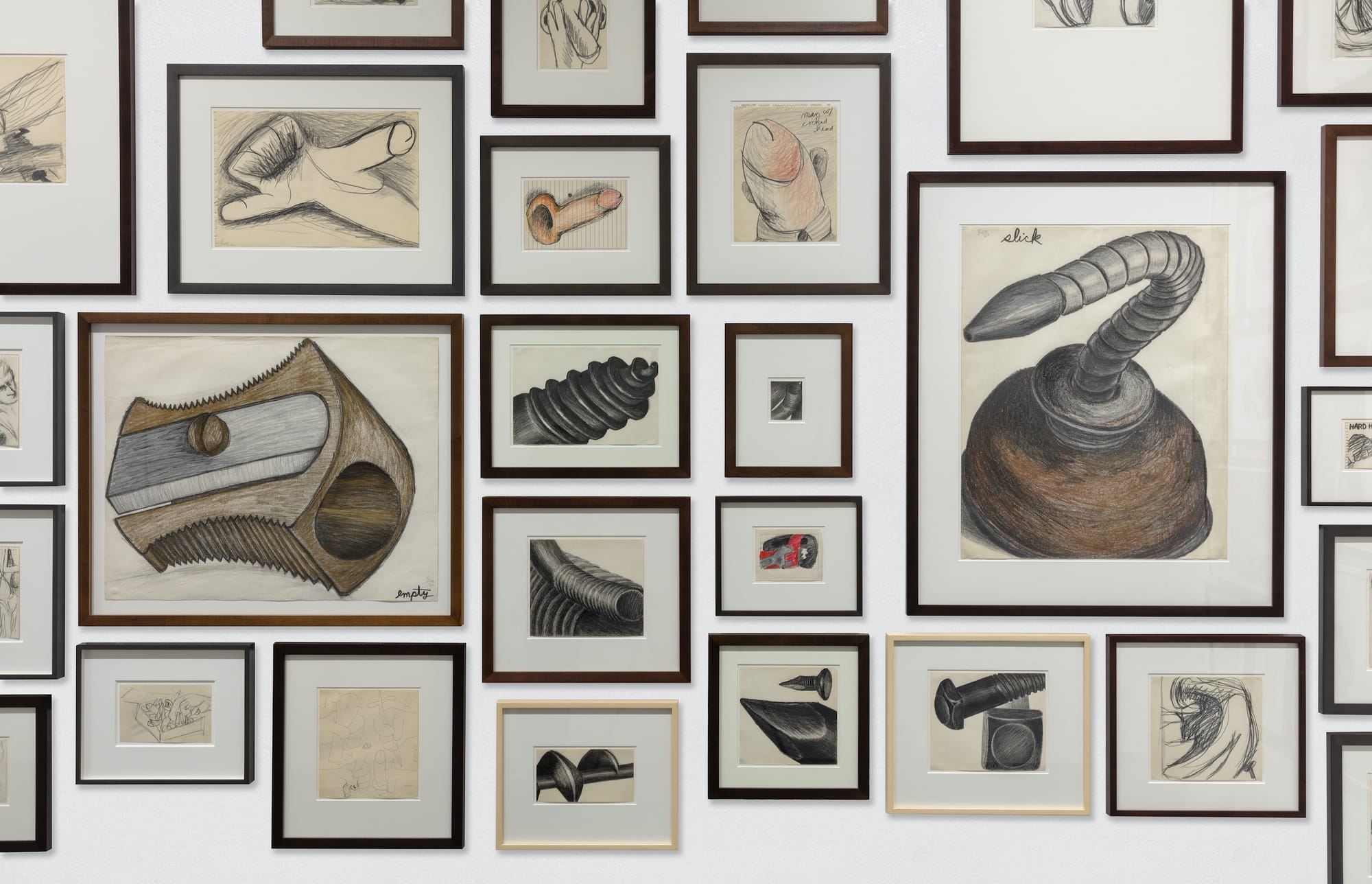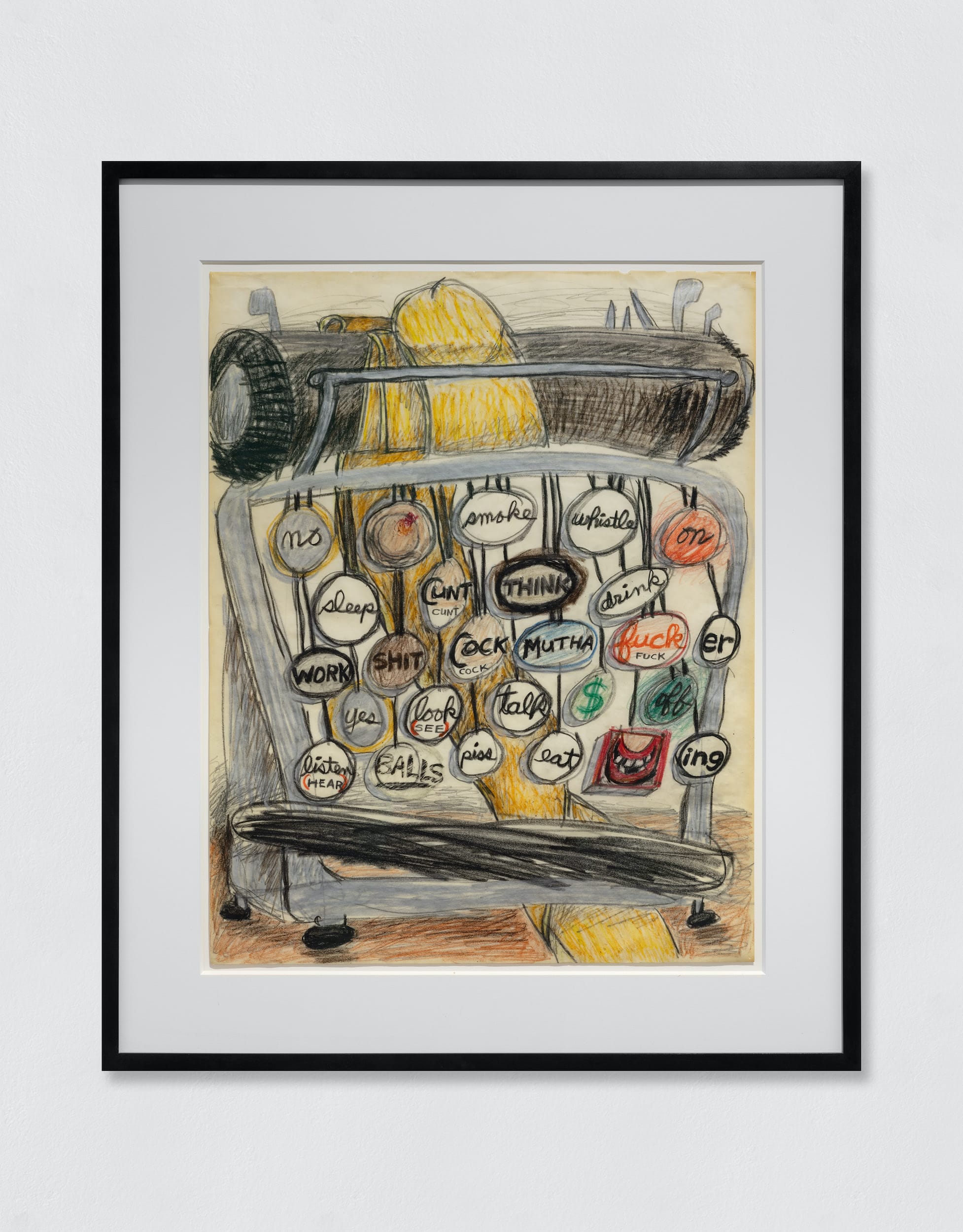The seven-room show opens with a visit to “General Strike” at the entrance before launching into Lozano’s early self-portraiture and a dense hang of drawings produced in the early ’60s. A row of graphite self-portraits on paper show the artist’s cheeky defiance; elsewhere in the room are color drawings; many of them, depicting images of genitals paired with naughty text, are as darkly humorous as they are provocative: A line of penis heads, drawn in colored pencil, is labeled with the line “finally cut them off”; “eat cunt for mental health” captions a rough sketch of a tube of toothpaste and a mustachioed face. Here and in a room entirely dedicated to the artist’s puns, phallic symbolism with a Surrealist bent abounds — crayons are penises, businessmen’s heads are bums, a flat penis wraps around the cylindrical carriage of a typewriter, whose keys display not letters but words one normally can’t print in American publications. But not everything is male: in “No Title” (1962), a hand holding an American quarter that displays the word “liberty” moves toward a reclining woman whose genitals have been replaced with a coin slot (the composition is a nod to Gustave Courbet’s “The Origin of Life,” 1866).