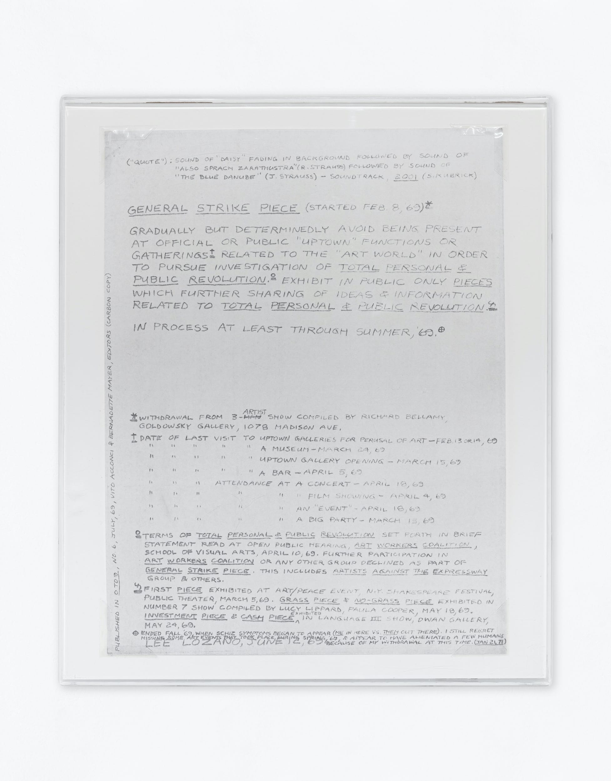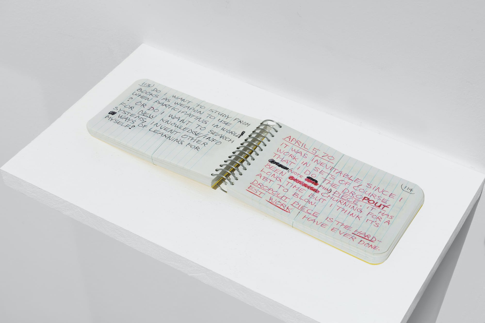 Ultimately, she did disappear. (She faded in other ways, too — born Lenore Knaster in 1930, she asked to be called Lee at age 14, but later reduced this further, to “E”; she also ate increasingly less as she aged, wasting away.) In the show’s last space, a tiny lined spiral notebook is opened to a page dated April 5, 1970. Lozano writes: "DROPOUT PIECE IS THE HARDEST WORK I’VE EVER DONE."