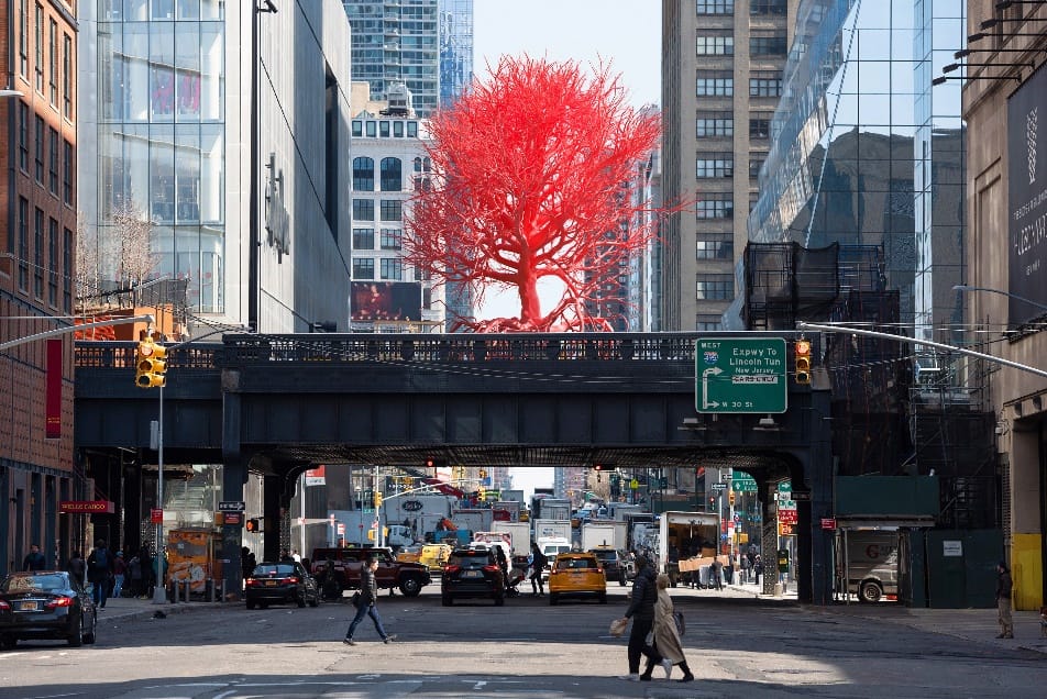 A fiery tree has emerged on Manhattan’s High Line Plinth at the intersection of Tenth Avenue and 30th Street. Created by Swiss artist Pamela Rosenkranz, the pink and red sculpture is surely going to become an Instagram hit — the blazing colors of the steel and polymer tree sculpture against a blue sky are particularly delightful.