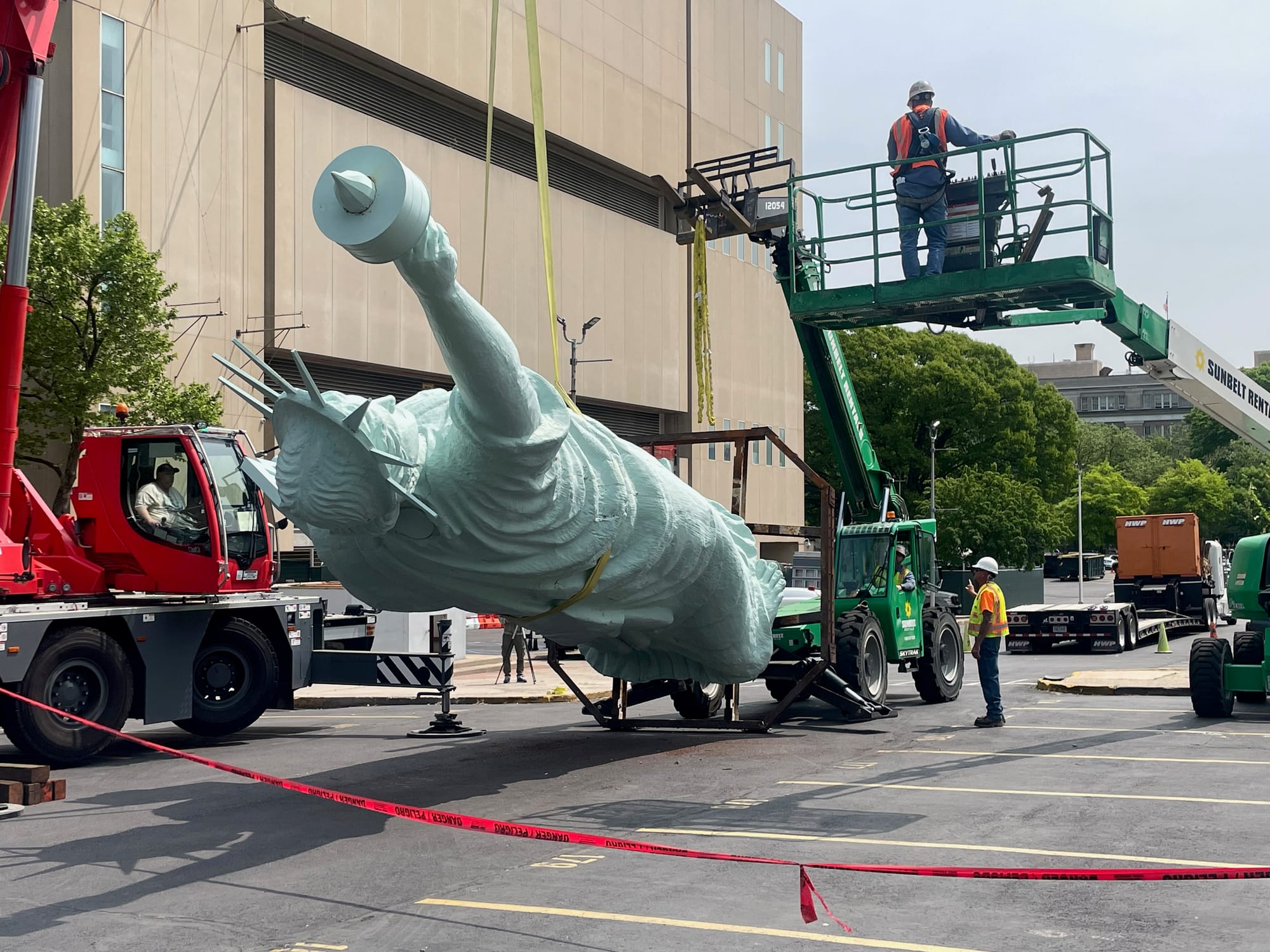 Michael Allen, executive director at NBAC, told Hyperallergic that the effort to move the statue over to the Midwest was spearheaded by the center's founder, Larry Giles, in 2017. NBAC and the Brooklyn Museum already had a well-established relationship as the latter transferred a large number of architectural artifacts from demolished buildings across New York City from its collection to be restored and cared for in St. Louis. Lady Liberty's transfer was postponed for years due to the pandemic and its subsequent impacts on the economy and shipping industry.