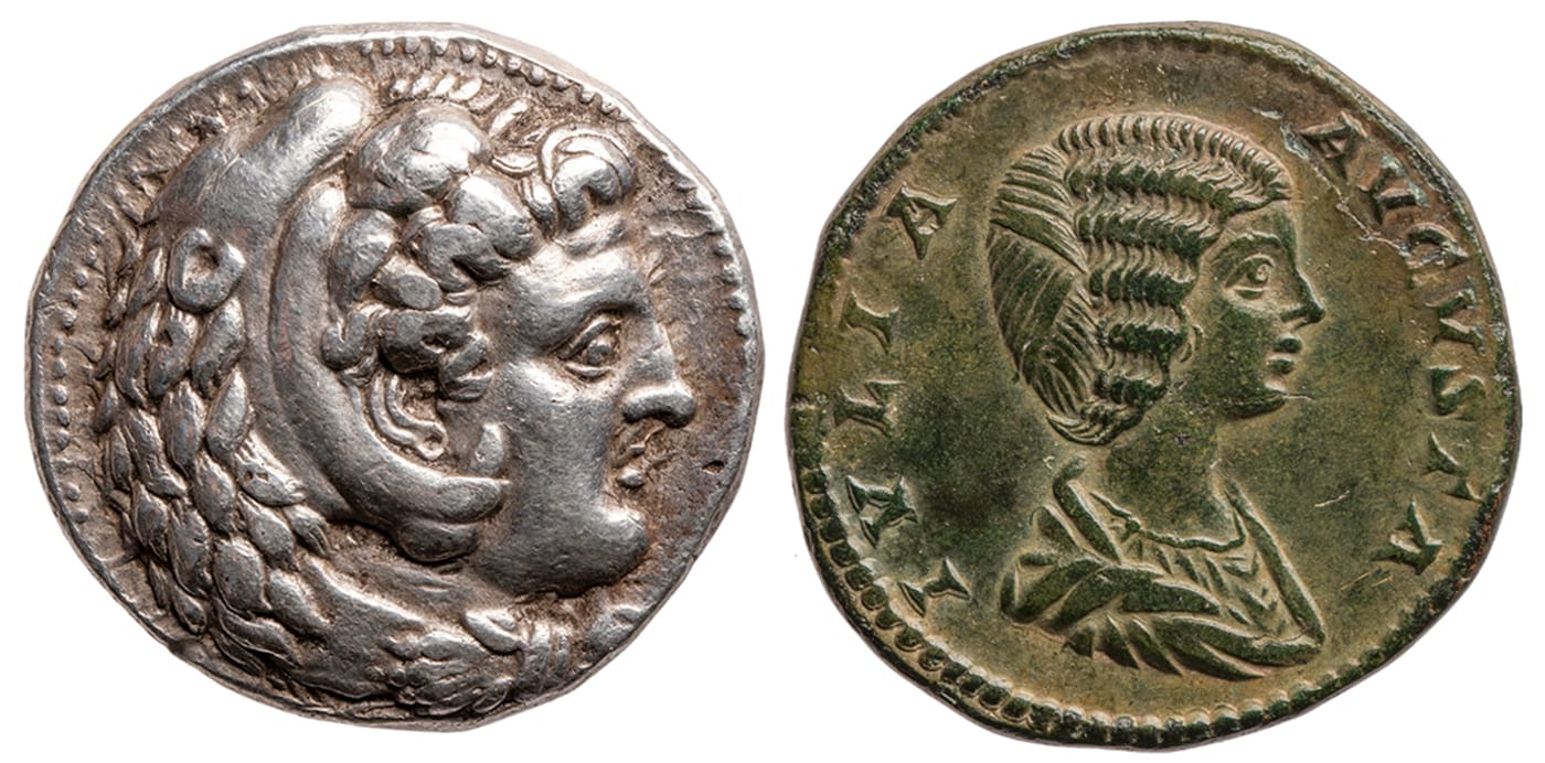 The other coin with a singular head on it is a humble Roman sestertius, a quarter of a denarius, or enough money to buy two loaves of bread at the time. It features Empress Julia Domna, wife and mother of emperors, known for her grandiose yet tragic life — one of her sons, future emperor Caracalla, murdered his brother in his mother’s arms, injuring her as well. Her elaborate hairstyle is represented in loving detail in this coin, one that inspired a fashion throughout the Roman Empire.
