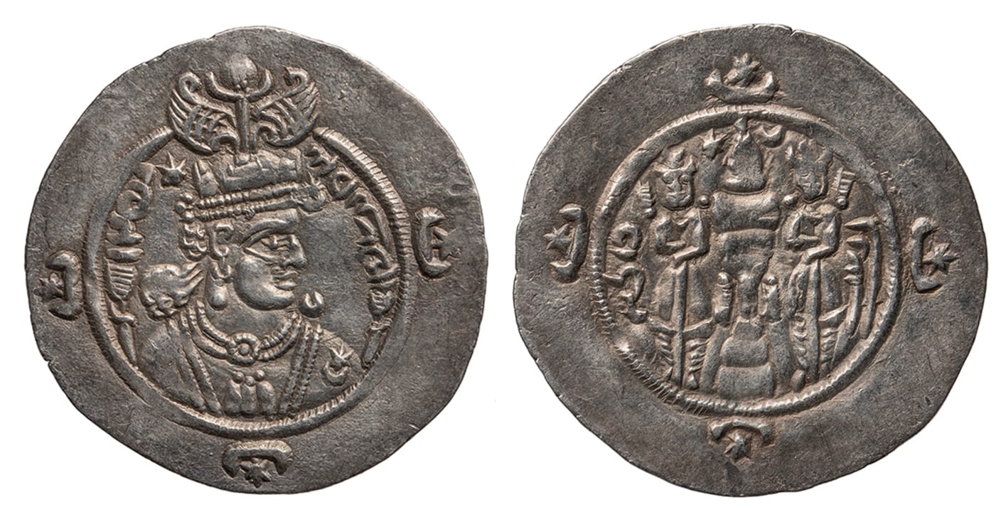 Two of the coins stand out for the ornate headgear and coifs of the figures cast in them. One shows King Ardashir III of the Sasanian Empire wearing an extraordinarily oversized winged and crenelated crown. This coin may have been used by Chinese monk Xuanzang — the subject of one of the displays — when he arrived in the oasis city of Bamiyan in what is now Afghanistan and the site of two giant 6th-century Buddha statues destroyed by the Taliban in 2001. Xuanzang was on a pilgrimage to India, the birthplace of Buddhism.