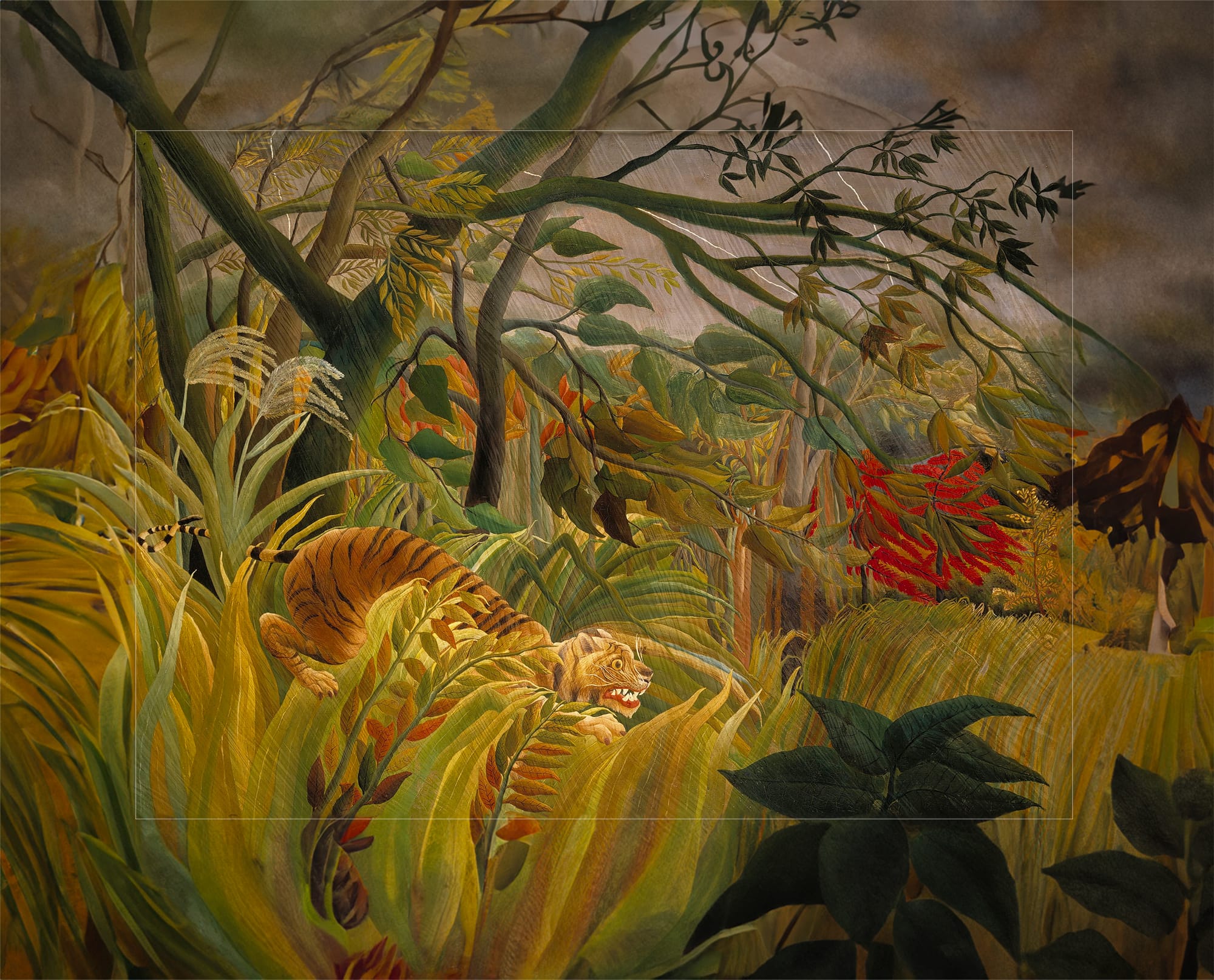 An expanded composition of Henri Rousseau's existing "Tiger in a Tropical Storm (Surprised!)" (1891), oil on canvas, 51 x 64 inches (image via Wikimedia Commons)