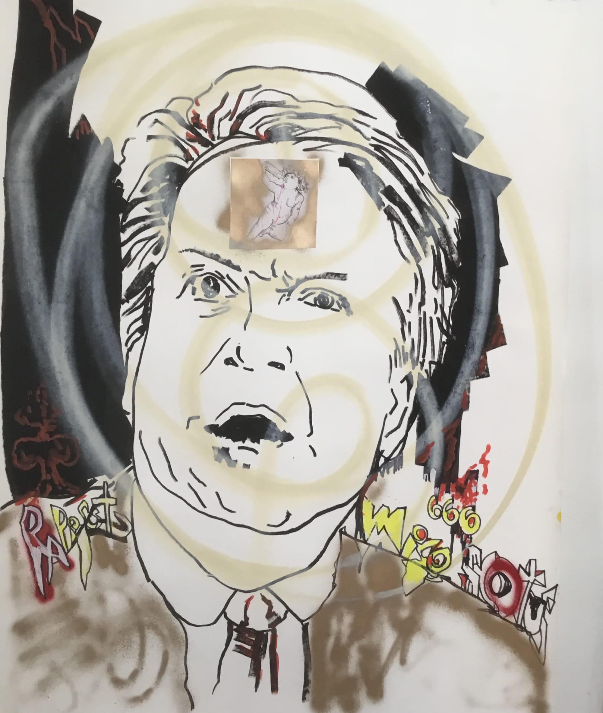 “I think it was a way for me to deal with the anxiousness and fear of a possible Trump presidency and the hate one could sense brewing among conservatives,” Vélez told Hyperallergic. “First came the illegitimate seating of Neil Gorsuch followed by the sad spectacle of Kavanaugh. The piece is a serious caricature of a dangerous character. The SCOTUS ruling I feel will suck the life out of young people in the US of America. I’m saddened for them and the ultra-racist and unequal country they’ll have to negotiate.”