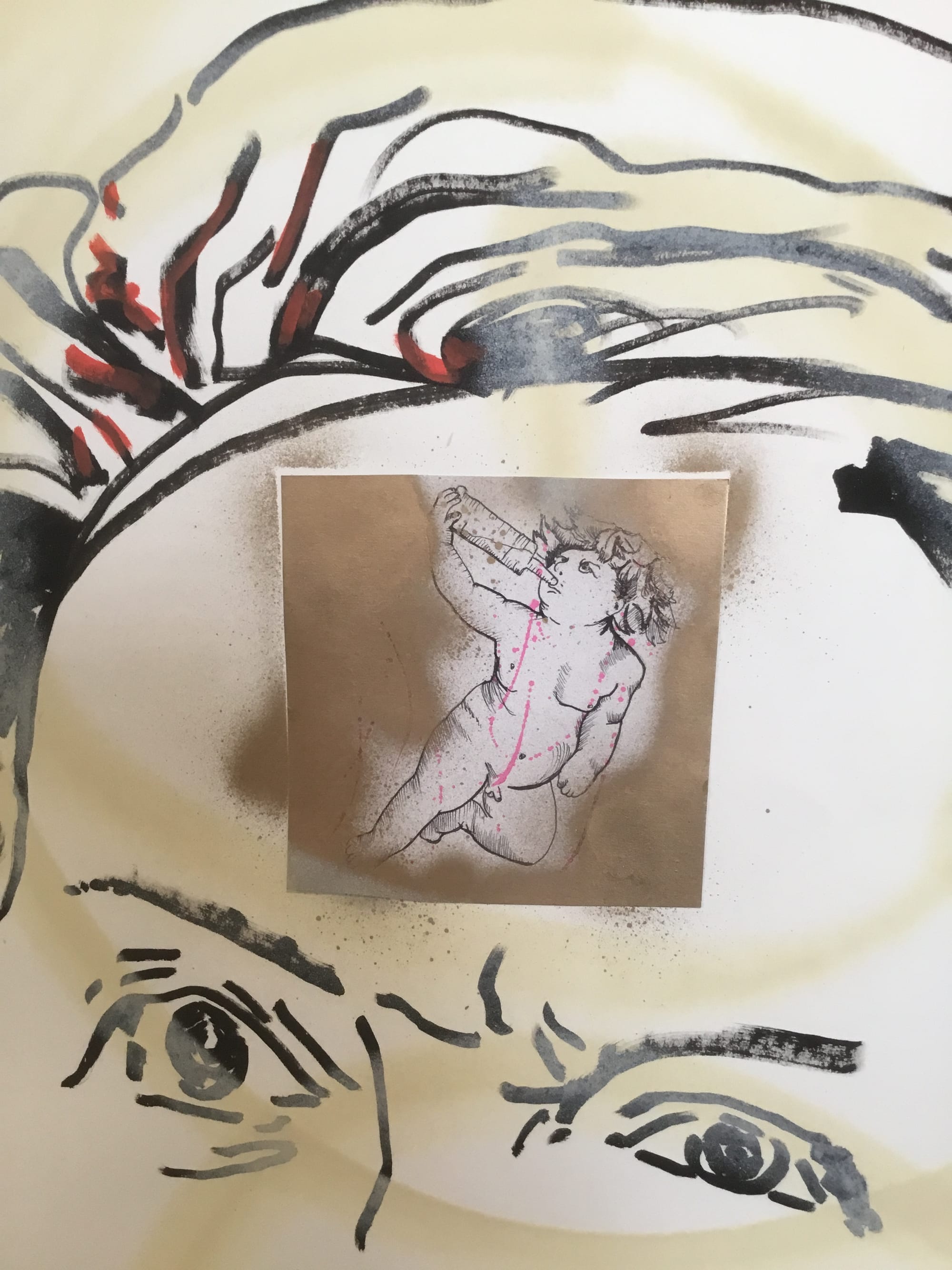 Some artists are revisiting older work that has become newly relevant as the reality of the Court's decisions sets in. Incited by this conservative downturn stripping away Americans' rights and liberties, Puerto Rican artist Pedro Vélez shared a mixed-media collaboration with Walter Fernández called "The Judge" (2019) on his Instagram. The collaged ink drawing of a cherub swigging from a glass bottle superimposed on a drawing of Supreme Court Justice Brett Kavanaugh during his 2018 testimony to the Senate Judiciary Committee is part of Vélez's Political Whiskey series (2016–2019), begun during the 2016 election cycle.