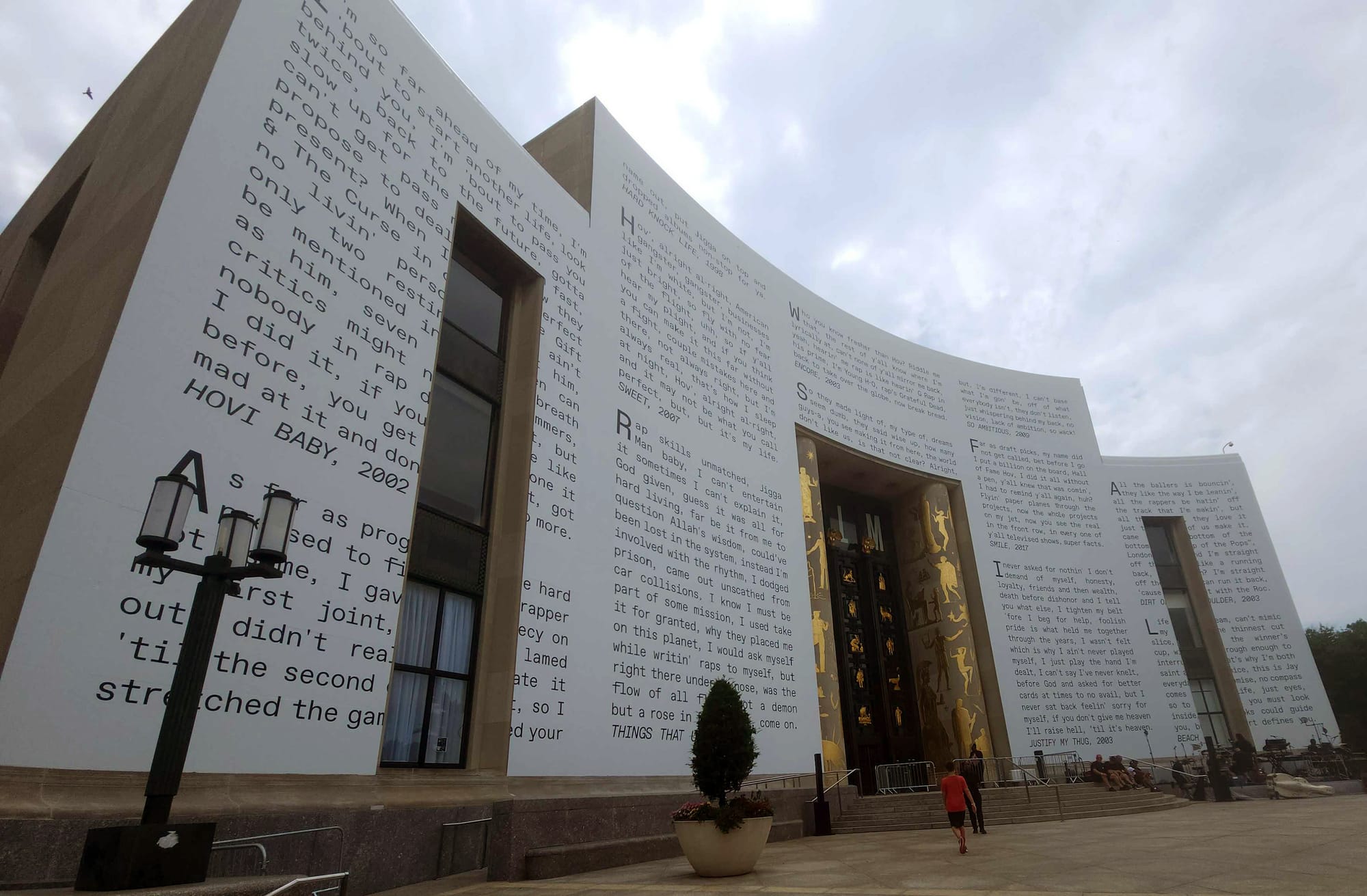 But for now, passersby can enjoy reading along to some of Jay-Z's biggest hits: "Hard Knock Life (1998), "Things That U Do," (1999), "Hovi Baby" (2002), "Dirt Off My Shoulder" (2003), "Encore” (2003), "So Ambitious" (2009), “Justify My Thug” (2003), "Beach Chair" (2006), “Sweet” (2007), and "Smile" (2017).
