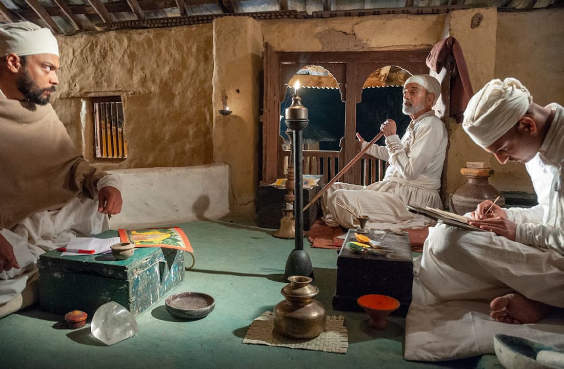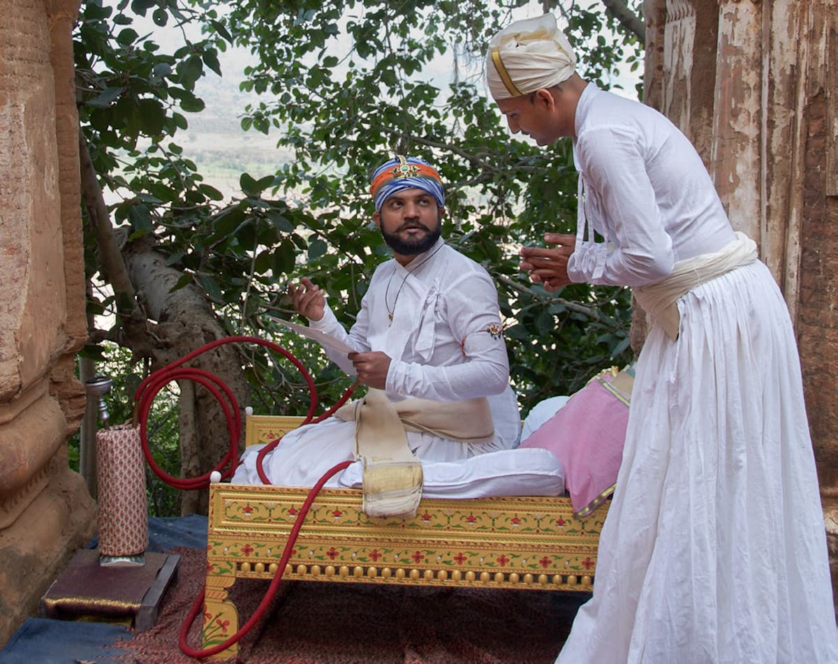 Fischer and Dutta both make the interesting choice of not recreating the dilapidated palace as a glorious period set, to reflect the chasm between Singh’s actual financial status and the lofty aspirations discernible in his portraits by Nainsukh. But Singh’s affinity for the fine arts led to some extraordinary paintings in which Nainsukh collaborated with his patron, directing him like an actor in elaborate tableaux vivants. Srinivasan asserts that such sequences in the film reinforce the argument that Nainsukh’s art wasn’t just optical, but was founded on imagination, Pahari tradition, and even fantasy.