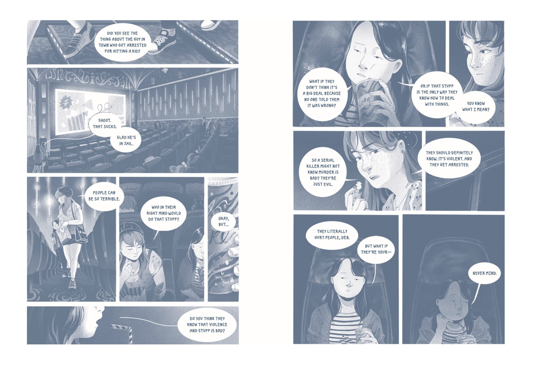 Drawn using Procreate on an iPad, Lee's moody, tonal panels depict both real and imagined conversations between book Deb and her friends and family and people she encounters on the daily. With a range of stories as benign as trying to escape the grape-flavored toothpaste at the dentist to hard-hitting moments about grade-induced panic attacks and interpersonal conflicts, Lee's sequential imaging finds its strengths in softness and texture. Every facial expression, hairstyle, and article of clothing is as gently and lovingly considered as the environments Lee's characters exist in, as that same attention is shown in the renderings of trees, architecture, and everyday objects. Lighting, weather, and surface textures are critical elements for Lee's narrative approach, and not a single detail is spared.