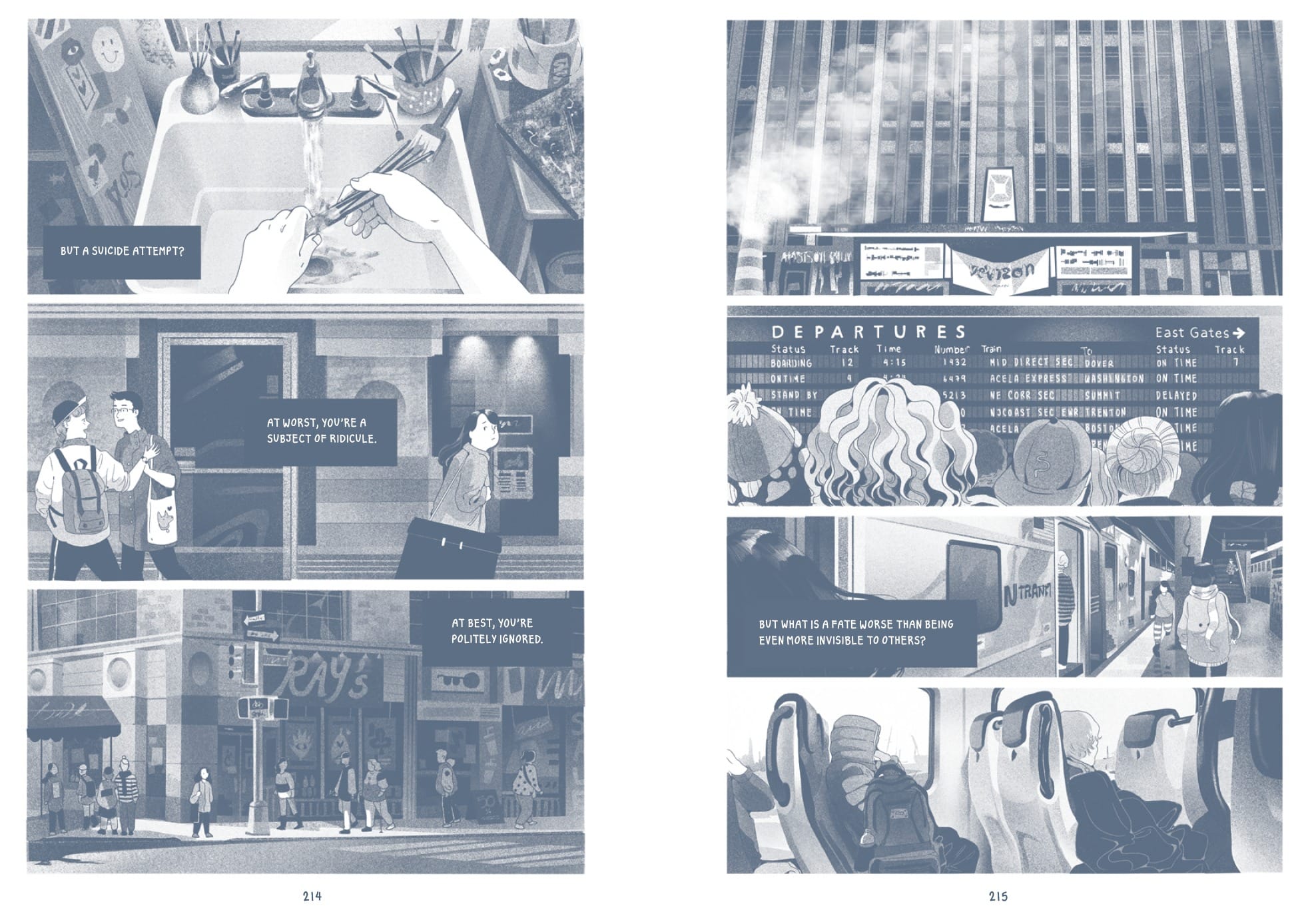 Through monochromatic but painstakingly rendered and expressive panels across 350 pages, Lee presents an uncomfortably relatable retelling of tri-state-area-coded microaggressions, flunking honors physics even with the extra help (only real ones will understand), the jarringly volatile nature of Asian immigrant parenting, and the day-to-day dredge of life with depression and not meeting expectations.