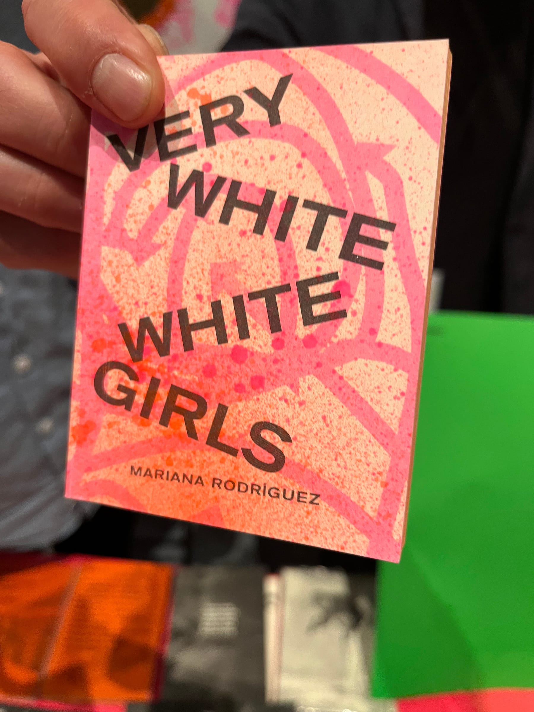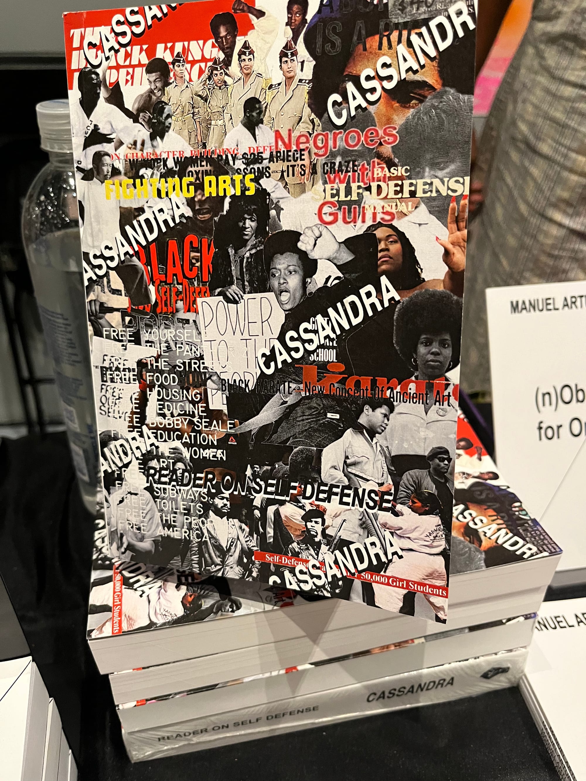 At the stand of the Mexican publisher Gato Negro Ediciones in the Friendly Fire section, Sammy Loren, organizer of LA’s Casual Encountersz alt-lit reading series, was discussing a reprint of his story “La Mora” with Mexico City-based publisher León Muñoz Santini (it was originally serialized across Mexico and in the tabloid La Prensa). It features, as Loren described, a “gringo” in Echo Park’s Stories bookstore who gets seduced by a Mexican con artist. Poet Mariana Rodríguez translated it into Spanish. When asked about Gato Negro’s highlights, he opened Rodríguez’s Chicas Blancas Muy Blancas (Very White White Girls), published in English and Spanish in 2022. “Very white — or not so dark — white girls explain extremely interesting things to me,” it reads. “They explain to me how to be a feminist, they tell me what I should read, how to exercise my human rights, my labor rights, my rights as a — not — white woman.” At the next booth over, the local Cassandra Press showed On Self-Defense (2022/2023), a primer on Black, Indigenous, and Chinese thought on both self-protection and White defensiveness.