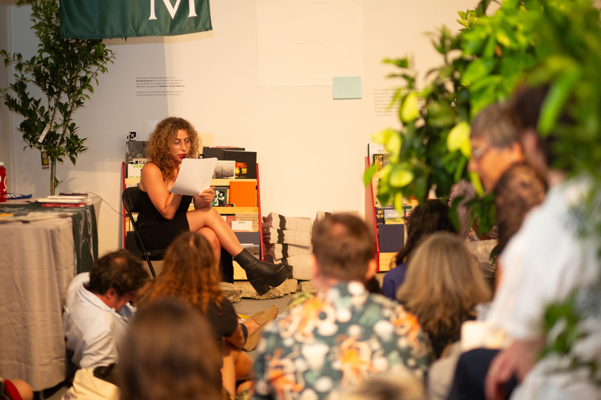 Eventually, I found my way to the poetry reading, which took place in a hallway. Semiotext(e) Co-Editor Hedi El Kholti sat up front, surrounded by other listeners perched atop soft cushions. Reines read from her new book, The Rose (2022), about plastic filling our bodies and her unfulfilling love affairs. She tossed pages onto the floor as she finished reading from them. “I felt I had to respect what seduced me, even if stupidly, even when it made me stupid,” she read. As doors slammed open, crowds shouted and greeted each other, and audience members came and went, Reines continued reading.