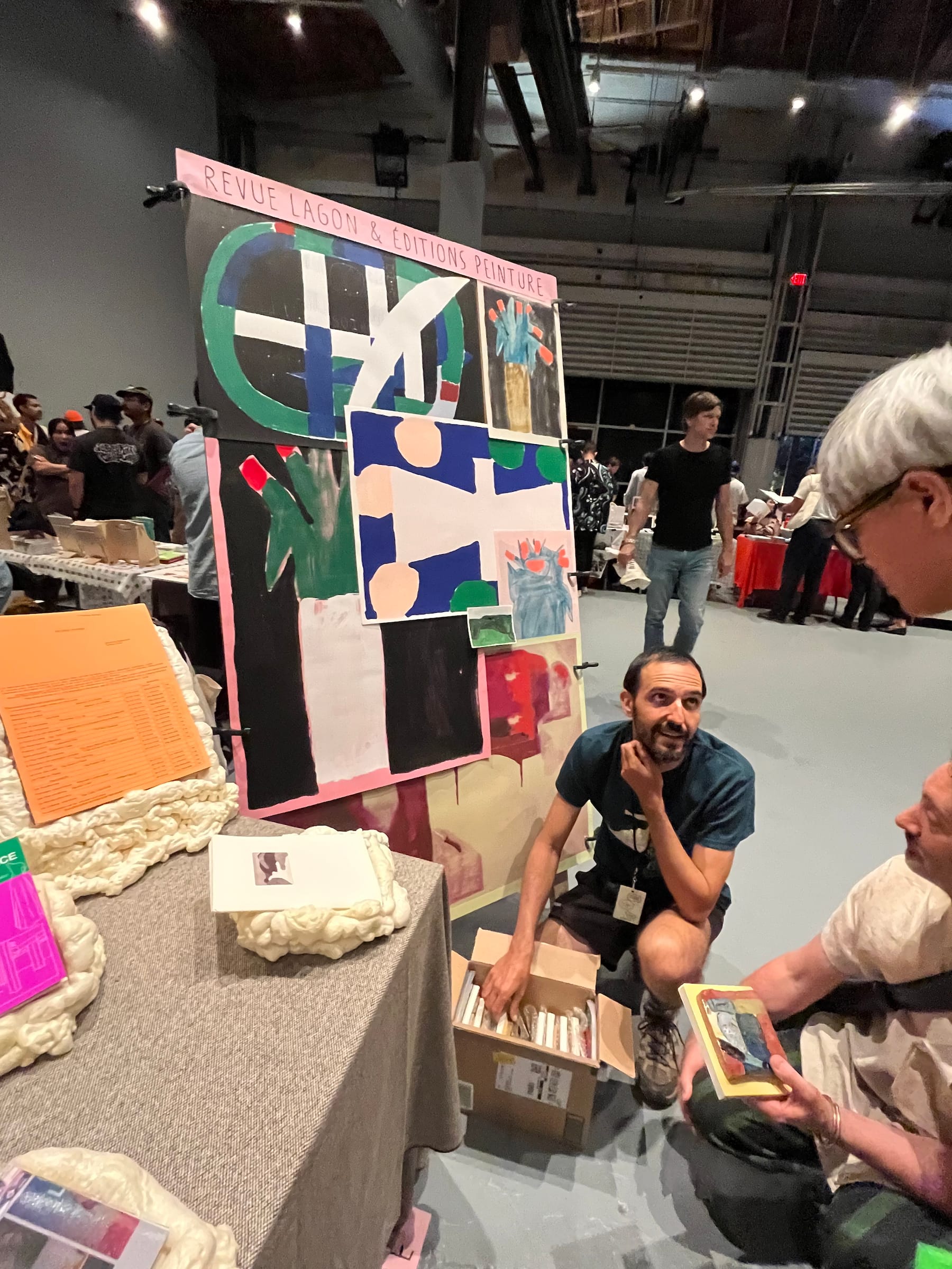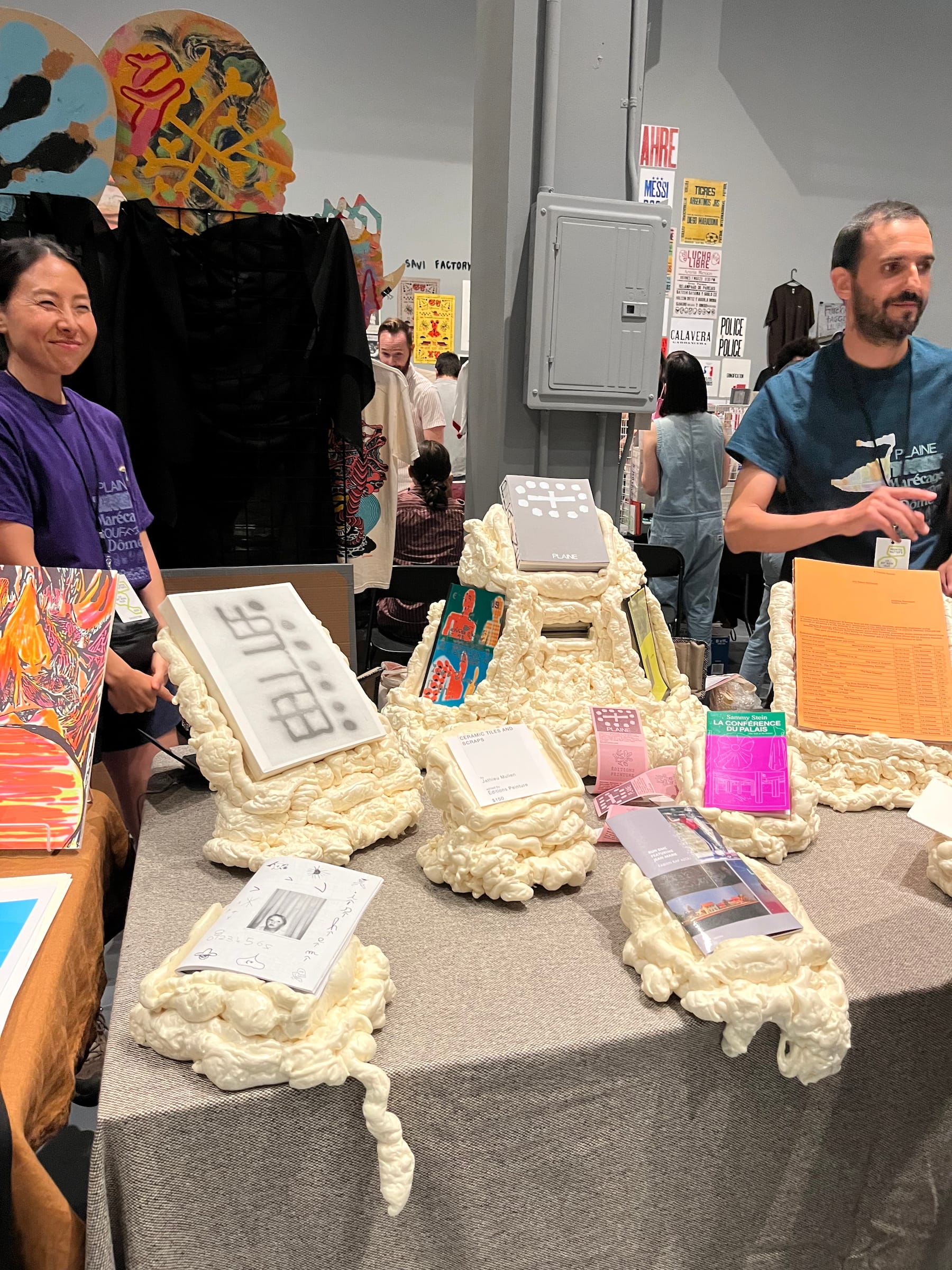 The most inventive presentation strategy goes to Éditions Peinture, which mounted their books and those of Lagon Revue atop charming, expanding foam supports. A mass of foam was also spitting out pink receipt paper that doubled as the company’s business card. At the booth, Jin Angdoo showed me Mathieu Julien’s books, which each feature a unique tile “cover” atop thick cardboard pages. Angdoo described the fair as “well-organized and proper” compared to what goes on in Paris, where she recently lived.
