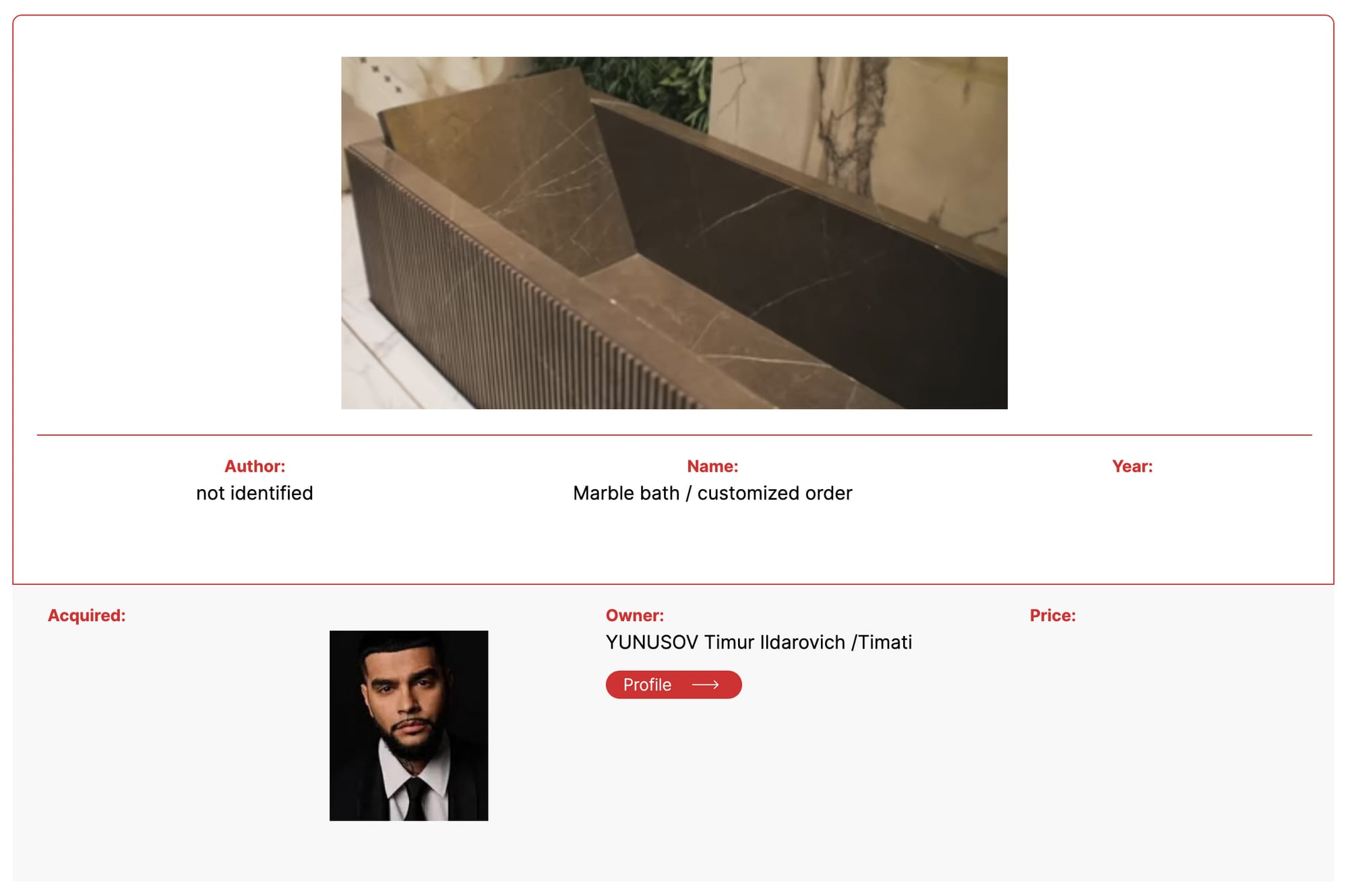 Unlike many of his counterparts, Russian hip-hop singer Timur Yunusov, better known by his stage name Timati, focused his aspirations on contemporary art, apparently aiming to amass the most massive collection of artwork by KAWS (Brian Donnelly). The son of an oil businessman and a vocal Putin supporter, Yunusov obtained at least 64 Bearbricks (vinyl collectible toys crafted in limited runs by Japanese MediCom in partnership with designers and artists) as well as Companions (a clown-like character conceived in 1999 and subsequently replicated extensively worldwide) by the Brooklyn-based artist. What else is in his collection? A Romero Britto drawing, a Zimmermann piano, and a marble bathtub.