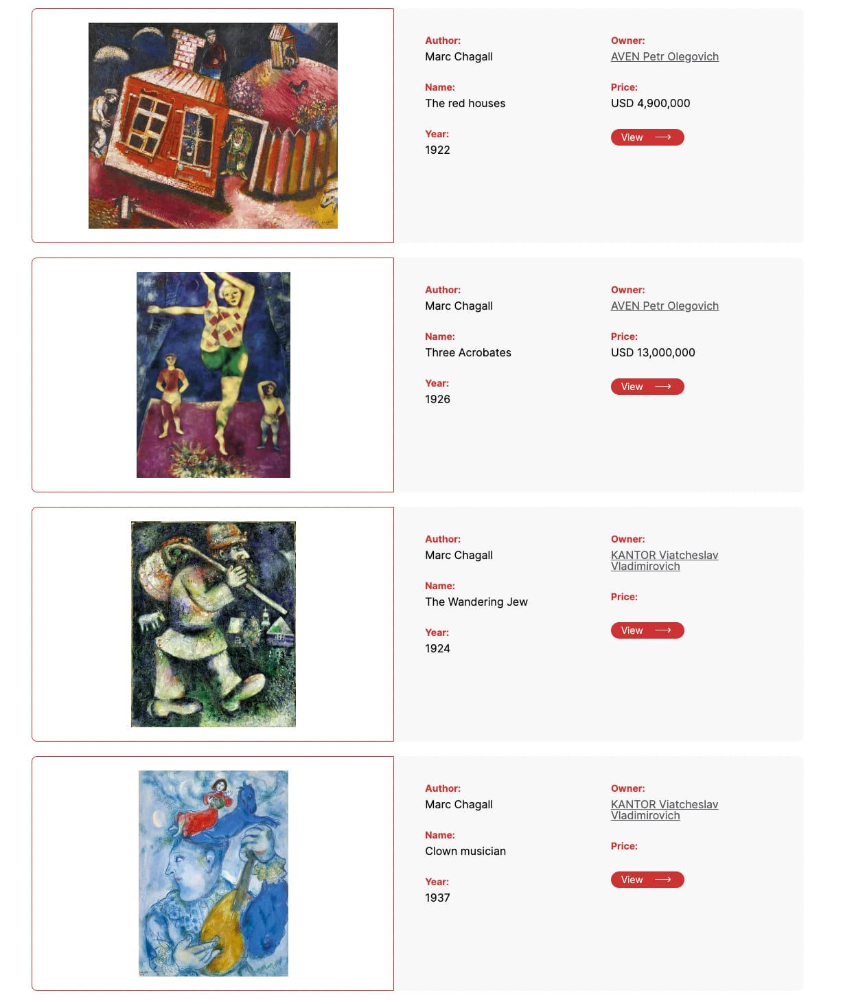 The most collected artist in the database is Marc Chagall. A prominent representative of early Modernism, Chagall is a Belarusian and French artist of Jewish origin whose practice was highly regarded by the Surrealists. His works are listed in the collections of three sanctioned Russians, including that of Petr Aven, a banking magnate and associate of Vladimir Putin. Aven, whom the United States Treasury Department recently sanctioned, has the biggest art collection of all Russian oligarchs presented in the database, with at least 159 objects, including paintings, sculptures, and furniture centered around the Russian avant-garde, Post-Impressionism, and Realism.