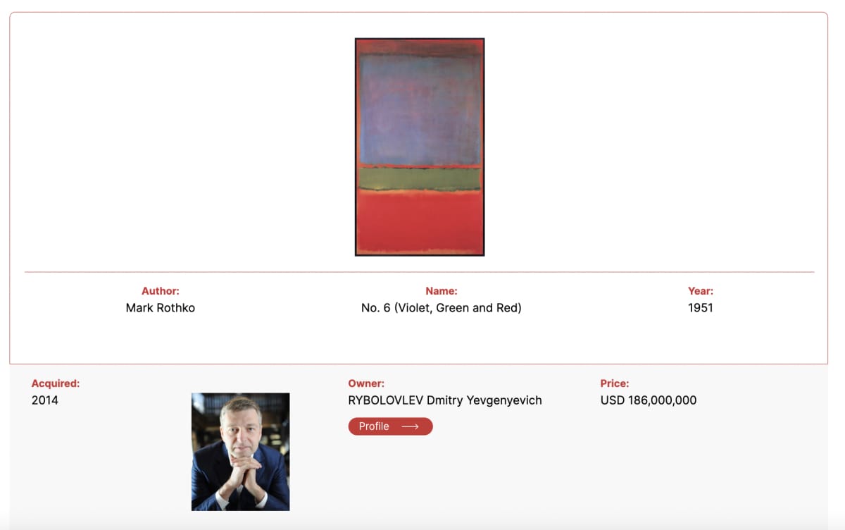 Let’s start with the spiciest — the most expensive artwork. Although prices are not available for all the objects on the portal, due to a “complicated” verification process and lack of official data, Mark Rothko’s “No. 6 (Violet, Green, and Red)” (1951) tops the list of the most valuable pieces. In 2014, it was sold at auction for $186 million at Christie’s to the Russian businessman Dmitry Rybolovlev, one of the top 200 richest people in the world, according to Bloomberg. (Rybolovlev once owned Leonardo's "Salvator Mundi," which sold for a record $450M in 2017.) As of now, Rothko’s “No. 6” is believed to be in the top five most expensive paintings ever sold publicly. Rybolovlev, who built his fortune as the owner of Russia's largest producer of potassium fertilizers, apparently collects mostly Western masters, with other pieces by El Greco, Picasso, and Renoir.