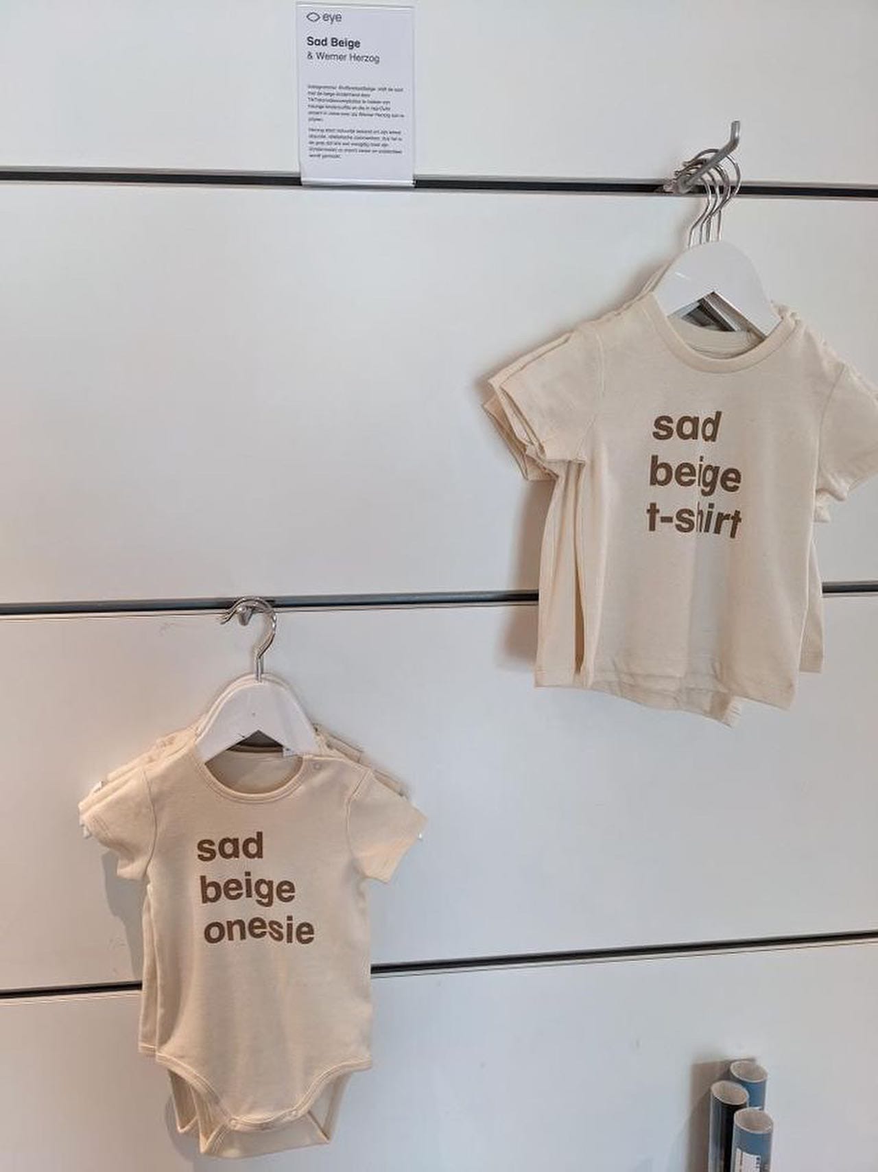 Last week, DeRoche’s project garnered attention from a major museum — but not in the way she hoped. As of Wednesday, August 23, the Eye Filmmuseum in Amsterdam was selling taupe-toned onesies and t-shirts emblazoned with variations of the phrase “Sad Beige,” launched in conjunction with an exhibition on Herzog on view at the institution through October 1. DeRoche, however, had no knowledge that the museum was creating and selling “Sad Beige” merchandise based on her work.