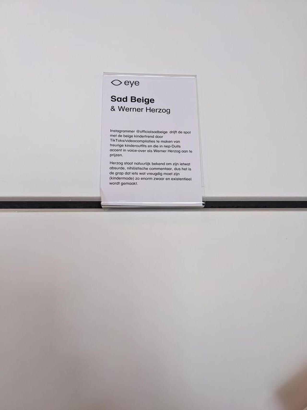 In an interview with Hyperallergic, DeRoche said that the museum published an article in July about Sad Beige to kick off its Herzog exhibition and cited her TikTok account, but did not ask for her input. She was only made aware of the “Sad Beige” merchandise when her followers sent her direct messages with images of the shirts and onesies hanging in the museum gift shop. DeRoche first contacted the institution on August 5 through an official complaint form on the Dutch Museum Gift Shop website, which sells items from a number of Dutch museums and hosts the online EYE gift shop, also attaching an invoice with her "standard consulting fee, along with some additional add-ons" for using her work without permission. After not hearing back for several weeks, she contacted the museum directly on August 22 via email, again including the invoice in her message. This time, she also noted that the museum was using screenshot collages as a part of the gallery of images accompanying the online listing for the merchandise. (Those collages were created by the author of this article for a Hyperallergic story in April 2022.)