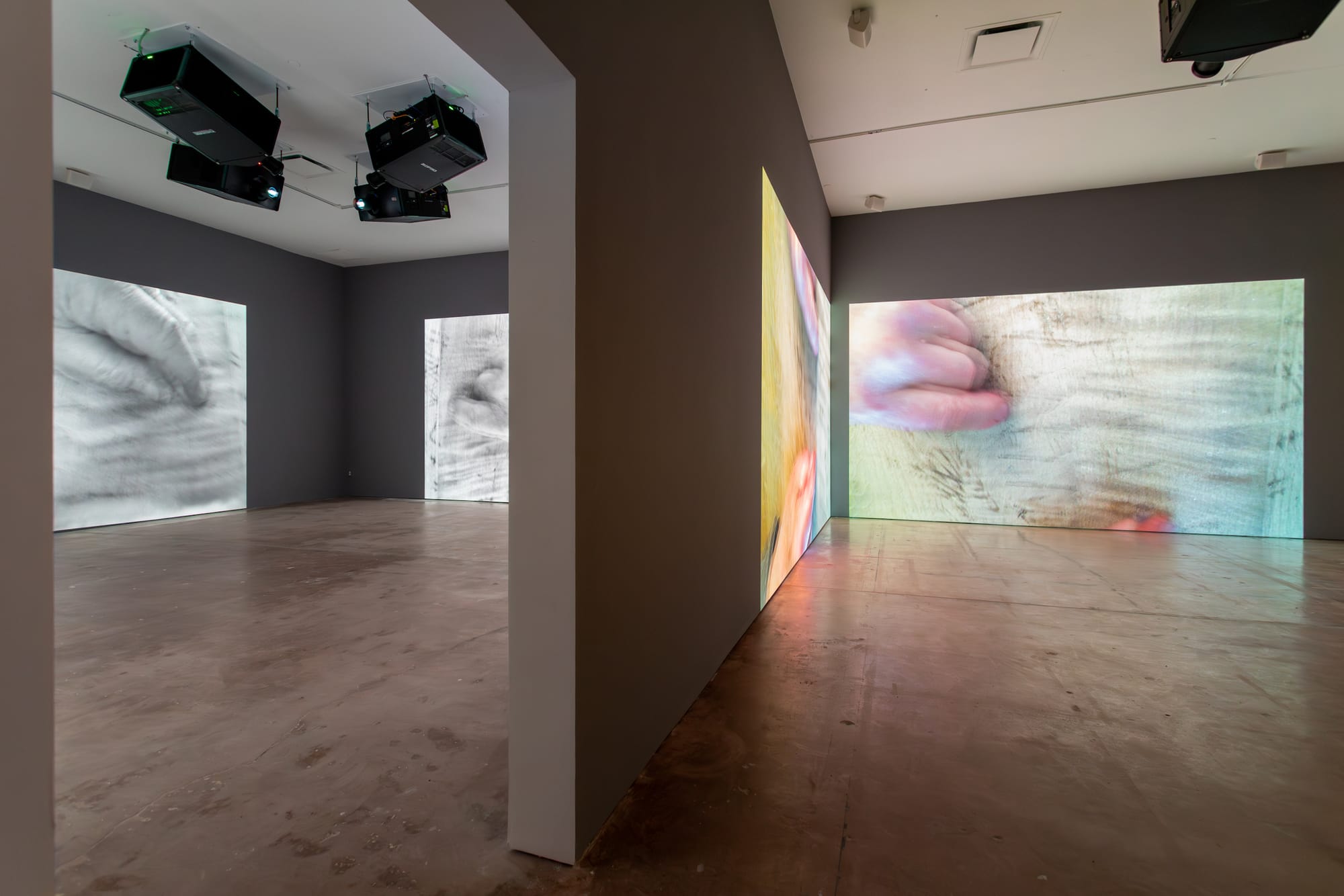 The eight channels of “His Mark,” a standalone piece in addition to being the exhibition’s title, sprawl across three different rooms — the first two side by side, the next two on opposite walls, and the last four in a room with a separate channel on each wall — frustrating any possibility of seeing all of the screens at once. The pacing of each gesture is consistent, and I became accustomed to the nearly forensic view of Nauman’s aging hands: the sunspots, the dryness of his skin, the flash of his wedding band; 3D indeed: there are moments when his knuckled almost-fist looked like it had jumped the fourth wall and was about to seat itself in the empty chair next to me.