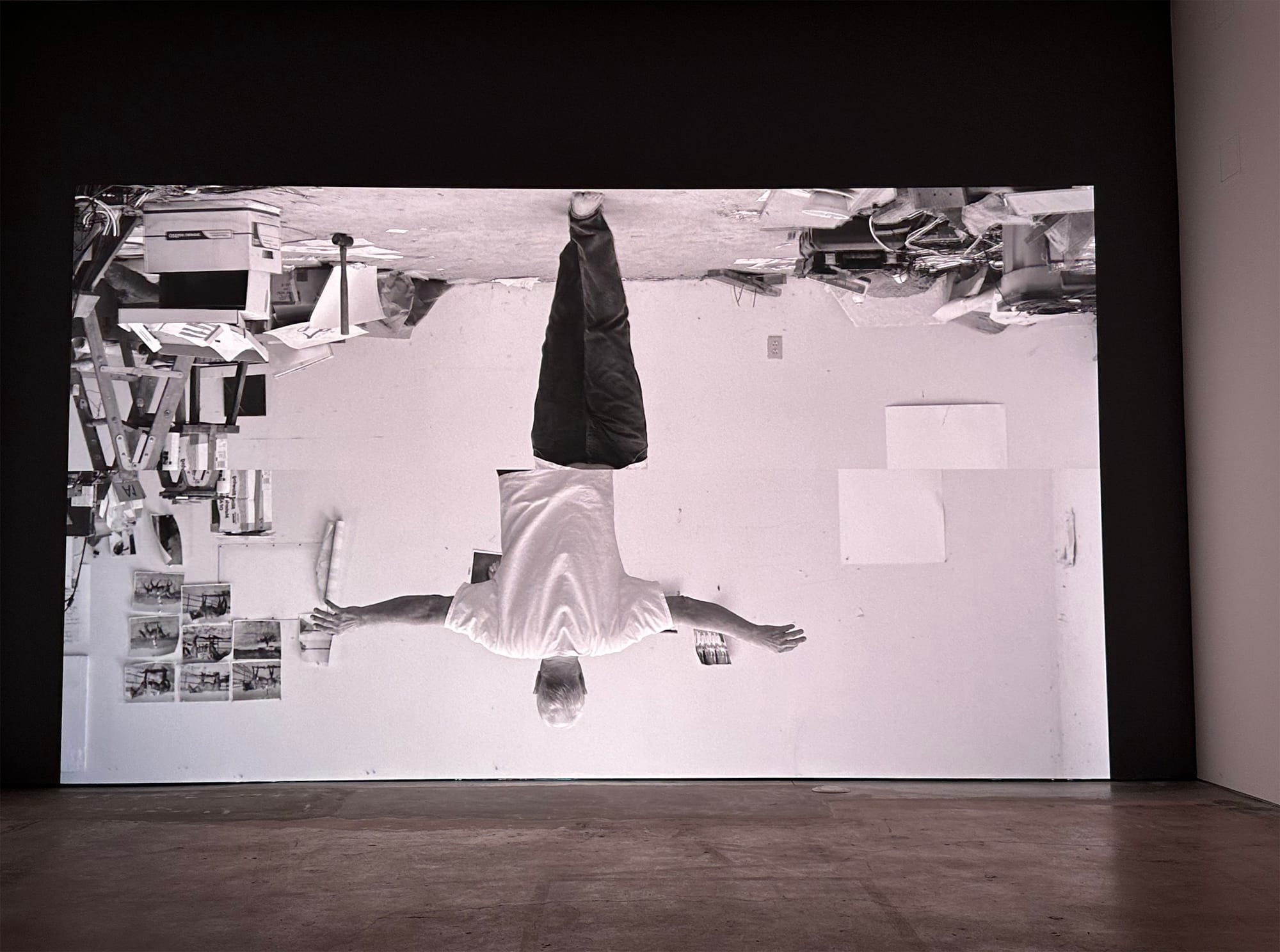 After a time, I gave up on trying to figure out the choice of medium or the number of channels, or why the channels were split across multiple rooms, and instead submitted to the transmitted feeling of a repeated gesture. Gestures, repetitions, and the body are familiar motifs in Nauman’s oeuvre. Seeing the hands trace the X over and over again quickly became hypnotic, and I began to feel a ghostly sensation of the table surface he was inscribing, as if I was also creating invisible Xs on it, repeatedly, alongside him. Instead of questions regarding materials and strategies (what is added by making the videos 3D?) I mulled over the choice of mark, the X.