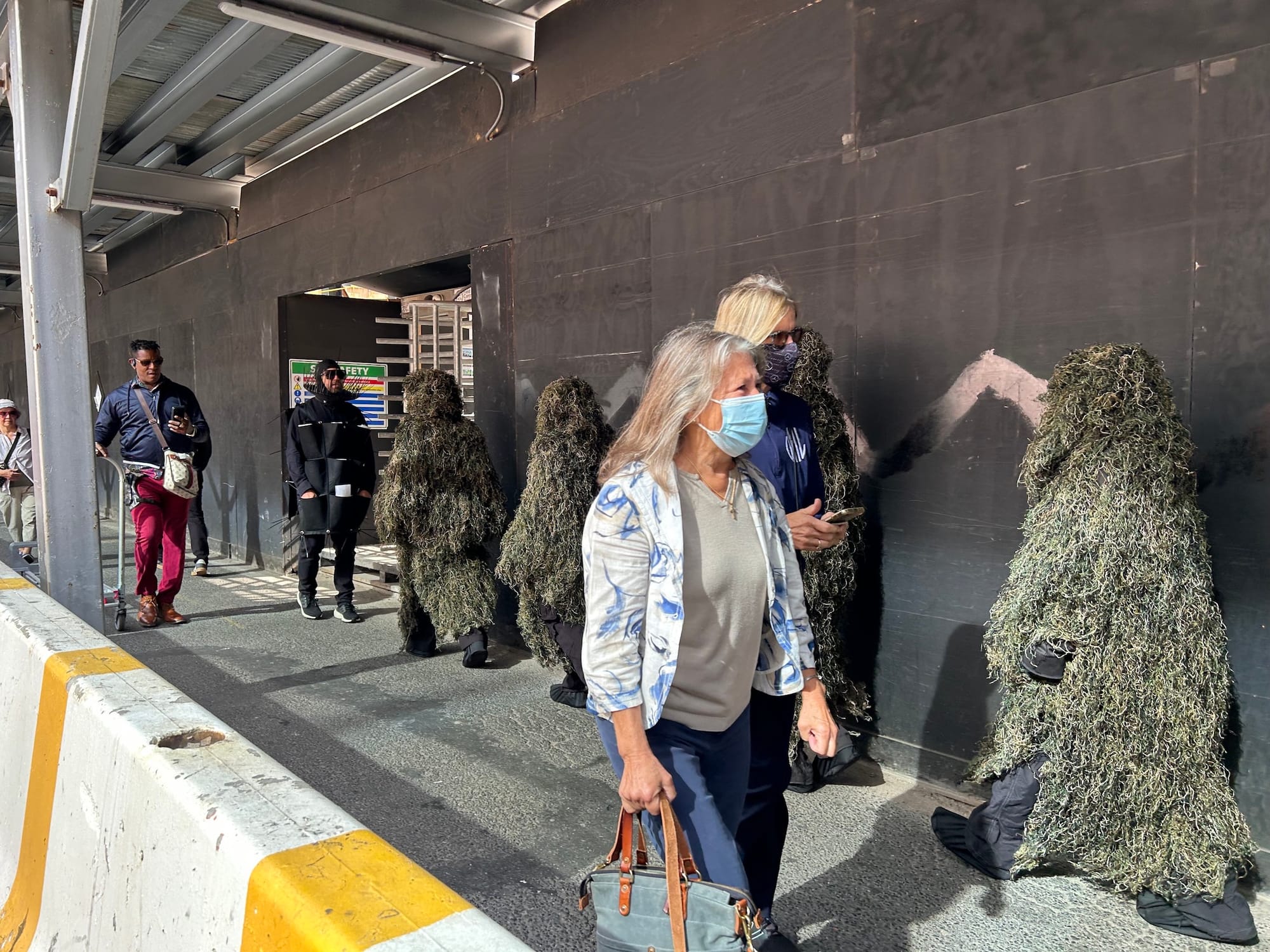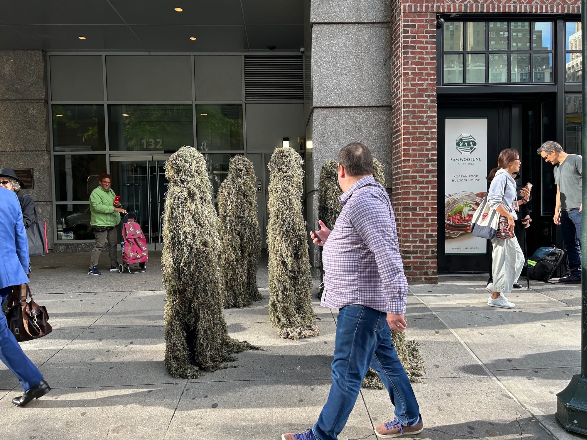 A new public art project is drawing attention to the over-development and demolishment of historical sites in the Pennsylvania Station neighborhood. In the early morning hours of Friday, September 22, the "Keepers" — silent, slow-moving, moss-covered beings that maintain the sacred balance of nature — appeared on West 32nd Street outside culturally significant sites like the Gimbel's Skybridge, the Church of St. John the Baptist, and the ruins of the Hotel Pennsylvania to spotlight these areas and the dozens of other historic buildings that would be destroyed under the state's Pennsylvania Station Area Civic and Land Use Improvement Project. Under Empire State Development, a consolidation of the New York State Urban Development Corporation and the New York Job Development Authority, the proposed plan to expand Pennsylvania Station and "revitalize" the Midtown area would effectively displace over 2,000 residents and eviscerate more than 1,300 small businesses housed in the neighborhood, according to data compiled by community organizers.