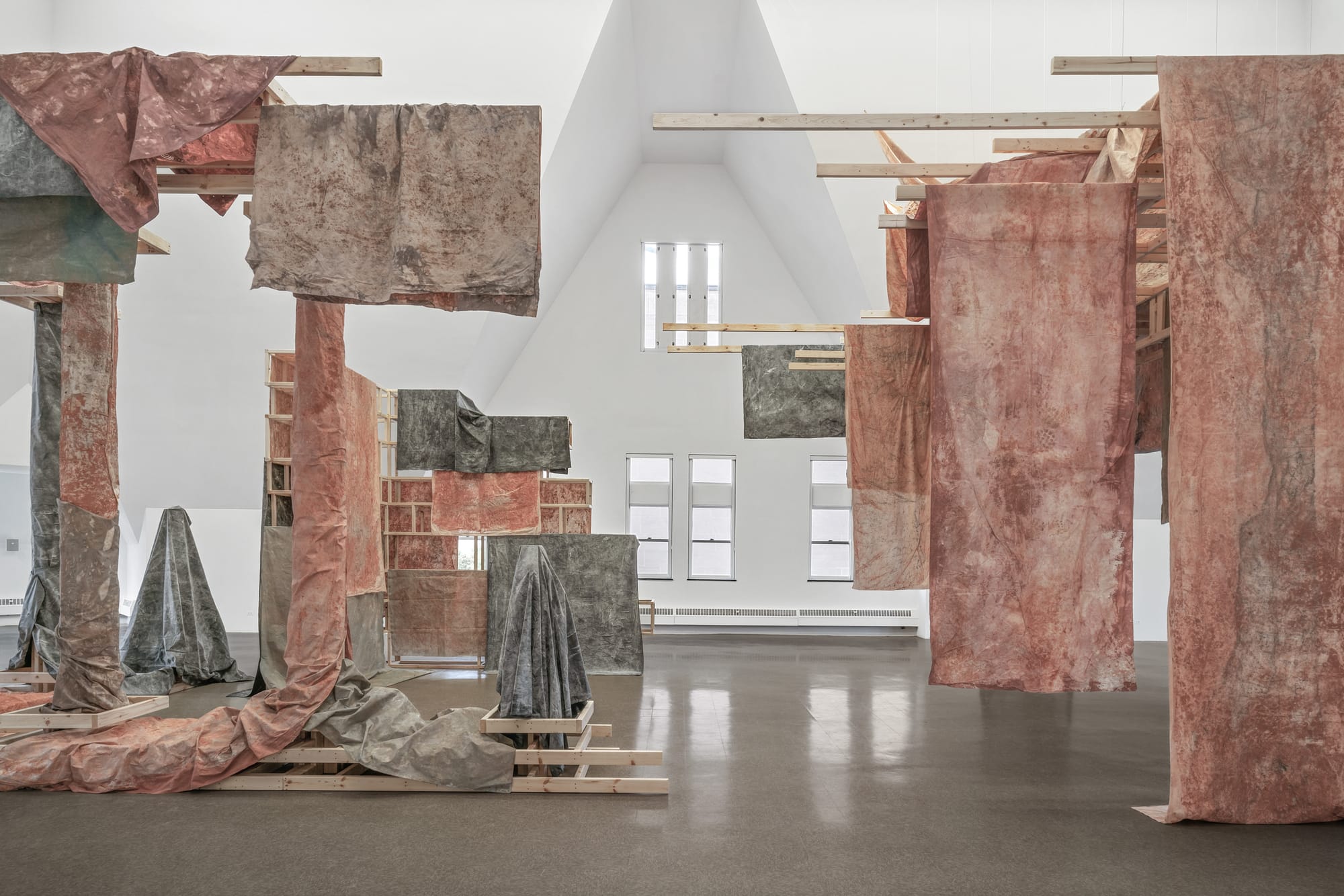 To create the elegiac work on view, Dala Nasser journeyed to the riverside cave in modern-day Lebanon where the myth holds that Adonis, the doomed lover of the Greek goddess Aphrodite, was killed by a boar. Springtime snowmelt infuses the river with red clay, which flows into the Mediterranean in seasonal tides, symbolizing his blood. Nasser made rubbings in the cave on long bolts of fabric, stained the cloth with ash and local clay, and draped these paintings on two large wooden structures in the vaulted space of the Renaissance Society. The pieces of cloth, encrusted with grit and pebbles, form curtains, shrouds, and walls that capture and hold the reverberations of a sound piece Nasser created with fellow artist Mhamad Safa: mourning prayers they recorded, slowed down, and then played and re-recorded inside the cave to incorporate its echoes. Even as university students clamor outside the gallery, the haunting space Nasser has created within is a world apart.