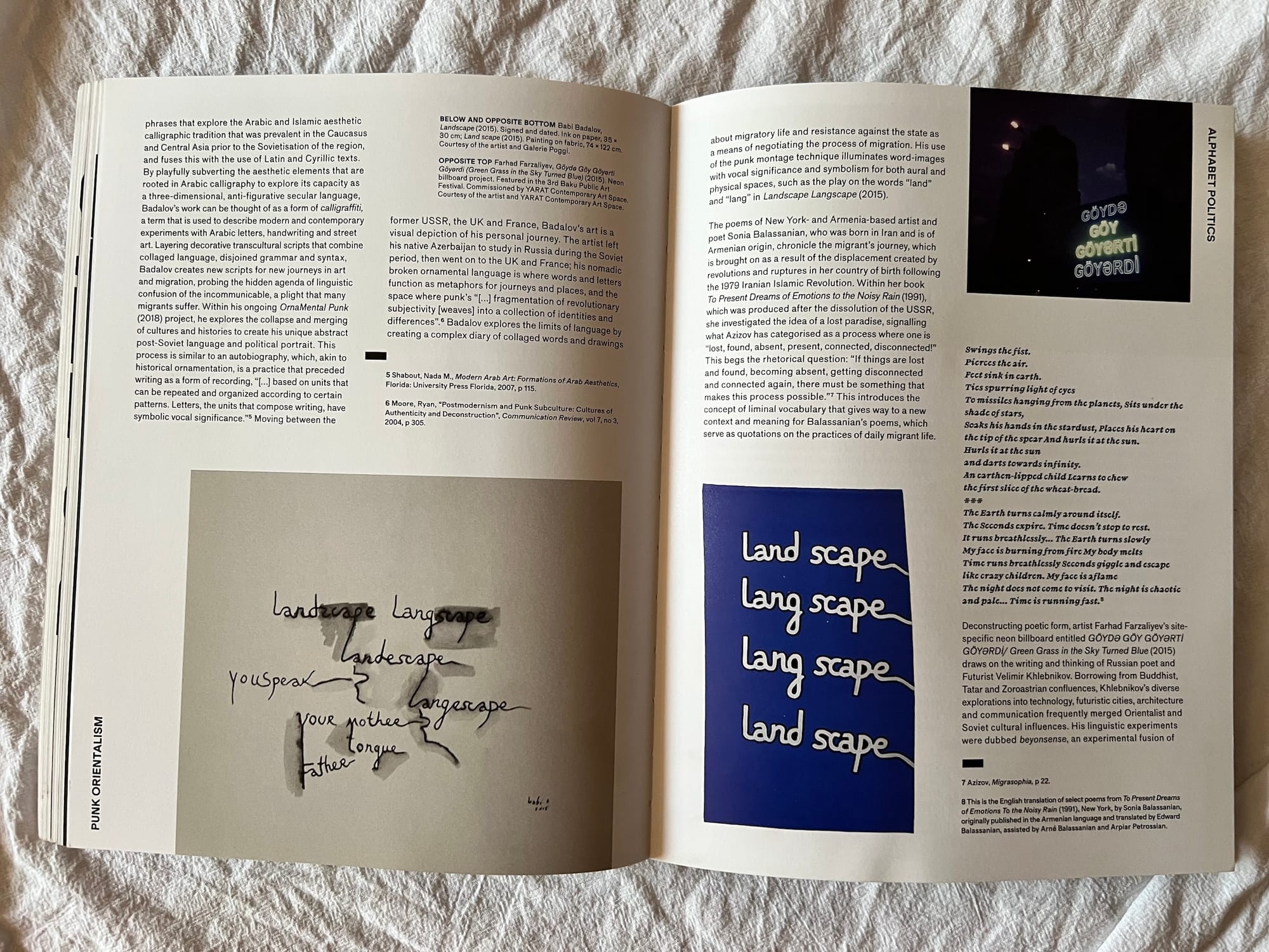 The country of Armenia is anathema to the ruling regime of Azerbaijan. Although Raza features some diaspora Armenian-made art in her Punk Orientalism curatorial project, none of these works are political or controversial, and there are no artists who were born and raised in the country of Soviet or Post-Soviet Armenia.