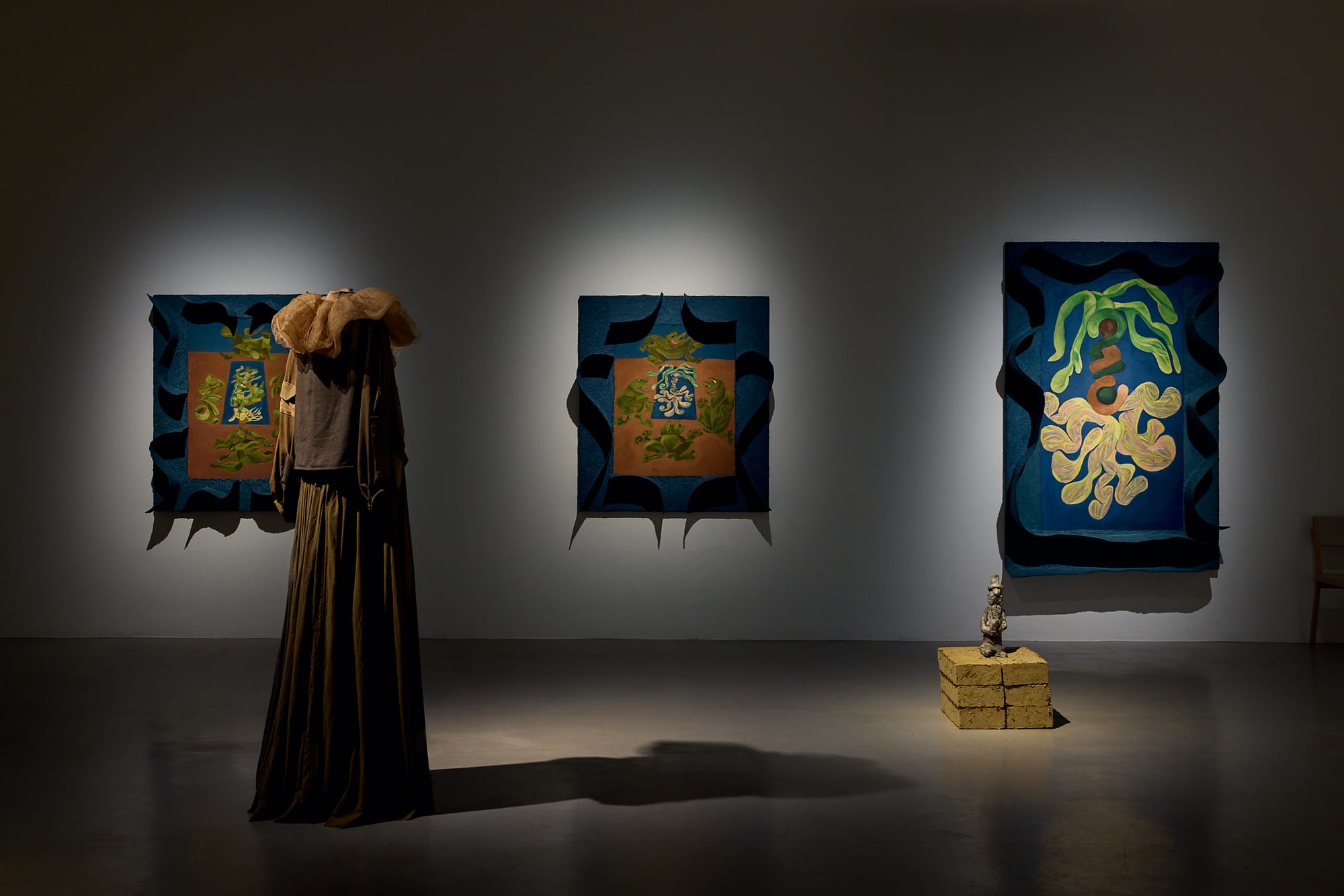 In both the film and the display of sculptures, the differentiation between the four characters is somewhat nebulous. Henderson’s world-building is multifaceted and complex — sometimes to the point of obfuscating her intentions. The central characters and personified forces are given a sense of physical form through a set of handmade costumes presented on rotating mannequins, with the wiring somewhat clumsily hidden under rubber mats. The execution is reminiscent of displays of craft work or historical objects. This effectively subverts visitors’ expectations around the conditions for viewing contemporary art, but it is also somewhat off-putting, particularly combined with the low light levels in the central exhibition space.