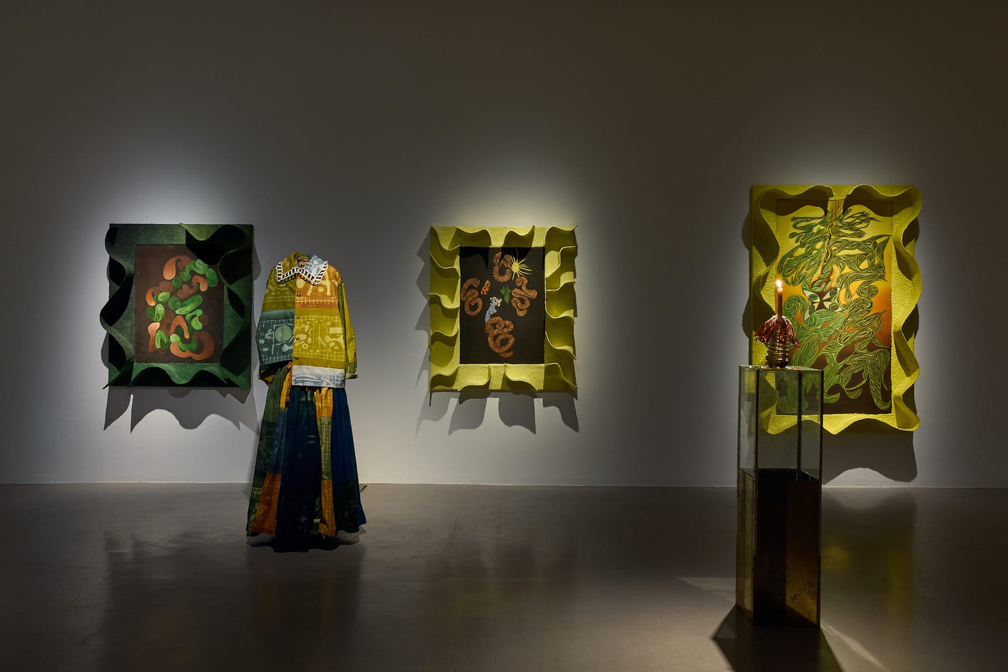 The dim lighting is presumably part of Henderson’s attempt to immerse viewers in the underground world of the worm. Light floods the exhibition’s final room, as the focus shifts to the force needed for plants to grow above ground, rooted in the worms’ fertile subterranean world. "The Gardener’s Bar" (2023) is a greenhouse based on the artist’s studio, filled with smaller artworks, objects, and interventions. While the display is engaging, the sheer variety of disparate items — from bespoke jewelry and collaged letters of the alphabet to bronze wizard figurines and blown-glass candle holders — can frustratingly obscure their meaning or connection to the show’s conceit.