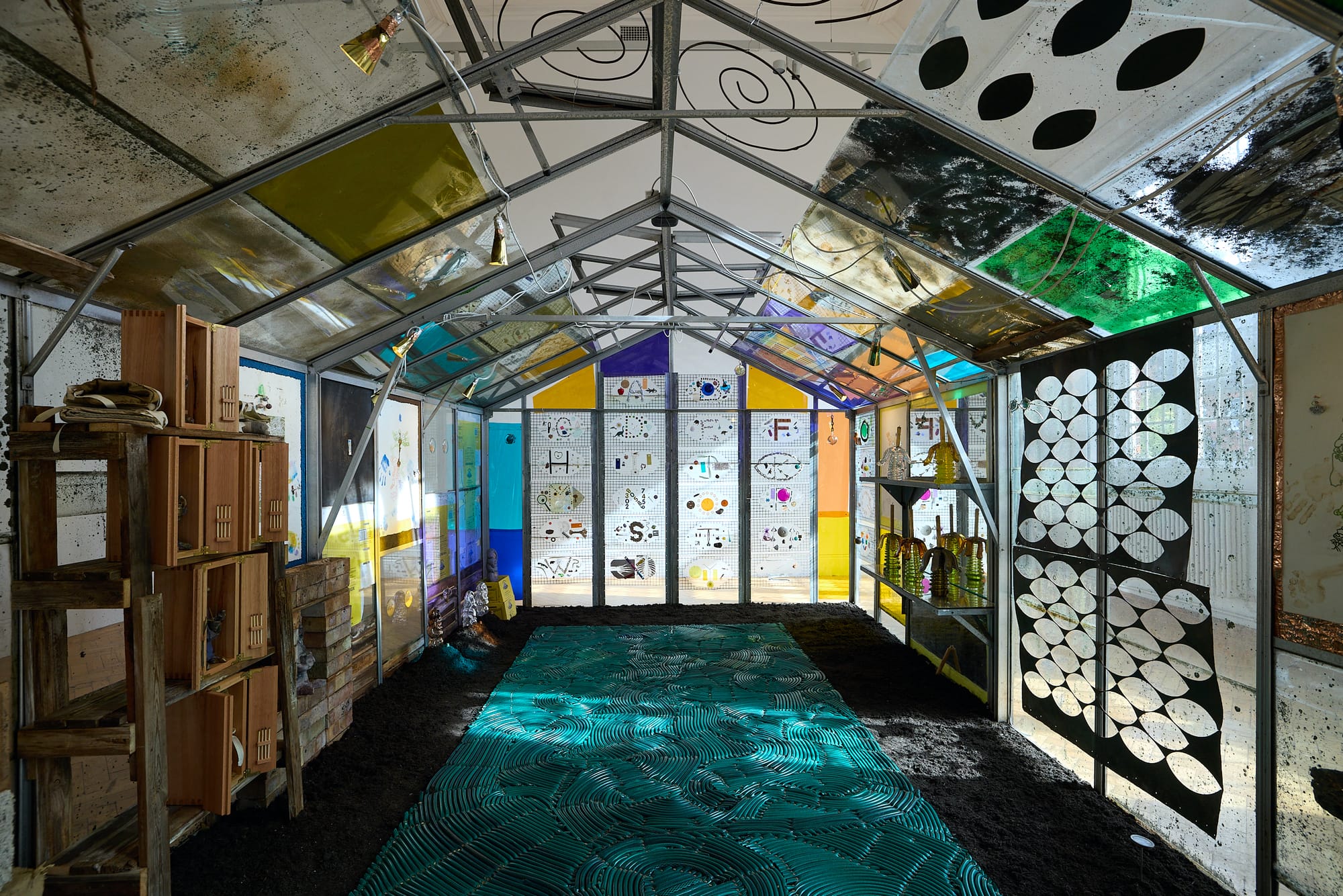 LONDON — Worms are unsung heroes of our world, playing a key role in ecosystems by breaking down organic matter and turning it into fertile soil. The almost alchemical power of worms is literally and figuratively at the heart of Tamara Henderson’s solo exhibition Green in the Grooves at Camden Art Centre, which features a large compost bin containing the creatures, with “do not open” scrawled across the lid. In Henderson’s conception, worms represent a link between life above and beneath the earth’s surface, transforming death and decay into rebirth and growth.