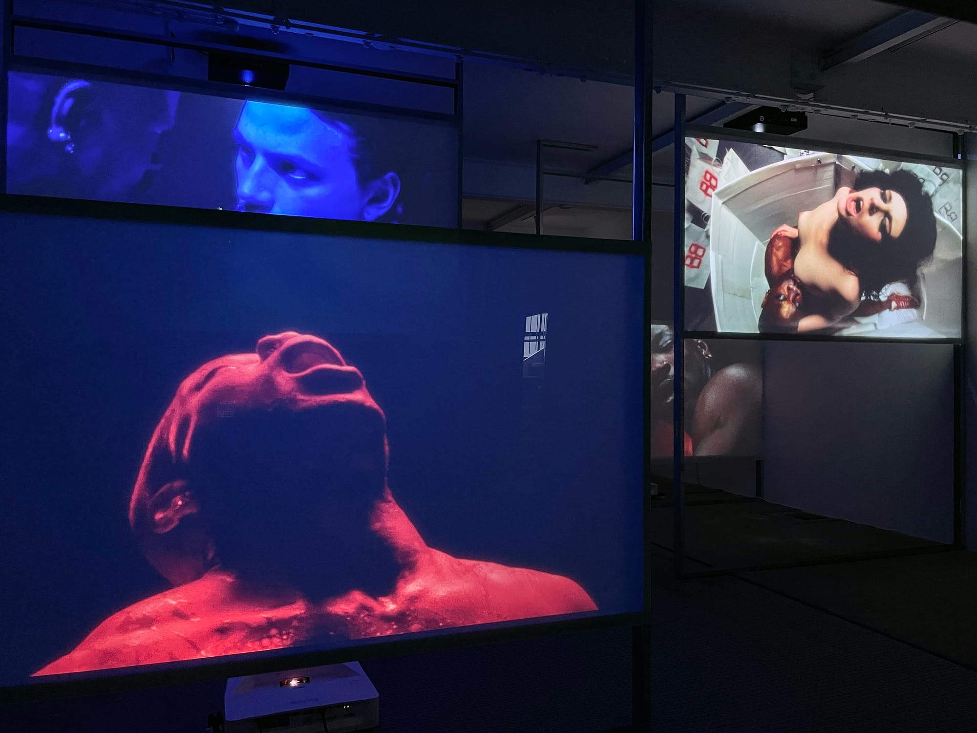 LONDON — Walking into a/political, viewers are immediately confronted with several screens displaying sex scenes. These scenes are fragments from The Visitor, Bruce LaBruce’s retelling of Pasolini's Teorema (1968), the story of an enigmatic, sexually fluid stranger whose intimate encounters with each member of a bourgeois family turns their world upside down. LaBruce’s scenes are accompanied by production stills, clothing printed with the political aphorisms that appear throughout The Visitor, and a rough cut of the film itself.