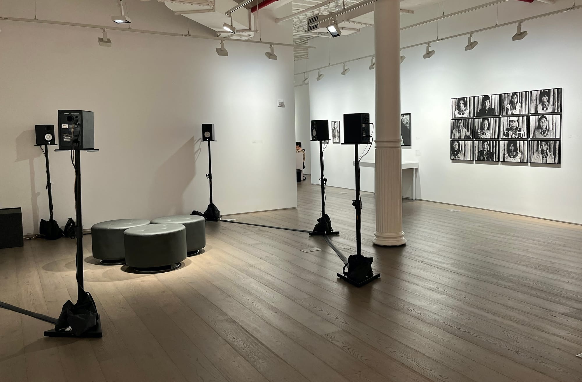 Consider two works situated next to one another in that opening section: Claudia Andujar’s grid of photographic portraits, Horizontal 2 – the Marcados series (Village: Ericó) (1981–83), and pablo sanz’s six-speaker projection of ambient rainforest sounds, "entangled" (2023). Andujar is renowned for her decades-long photographic and activist work with the Amazon’s Yanomami people. Yet these portraits, taken as identification images for a government vaccination campaign, showcase her unsmiling, number-wearing subjects in a dour ethnographic light. Conversely, sanz’s rainforest soundscape teems with the buzzes and chirps of multi-species life. Both artworks are powerful but the former requires context while the latter is more readily understood through the senses alone.