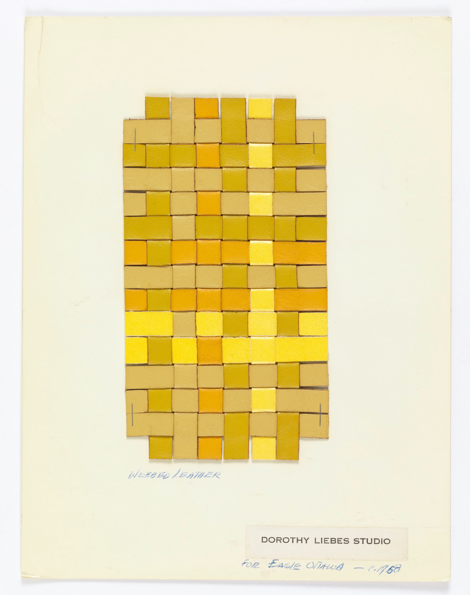 From opening her first studio in San Francisco in 1930, during the Great Depression, until her death in 1972 in New York City, Liebes’s career intersected with a rich swathe of American history. Nationwide restrictions on using certain fibers and dyes, which came with World War II, led her to experiment with unorthodox materials. The postwar years brought a boom in the invention of new polyester and nylon fibers, like Orlon, Dacron, and Antron, marketed for their durability, washability, and wrinkle-resistance. Liebes promoted these materials, appearing in commercials and incorporating them into her own designs. She also worked as a consultant, advising more than a dozen manufacturers, including DuPont, Sears, and Doebeckmun Company, makers of Lurex, a metallic yarn she helped popularize.