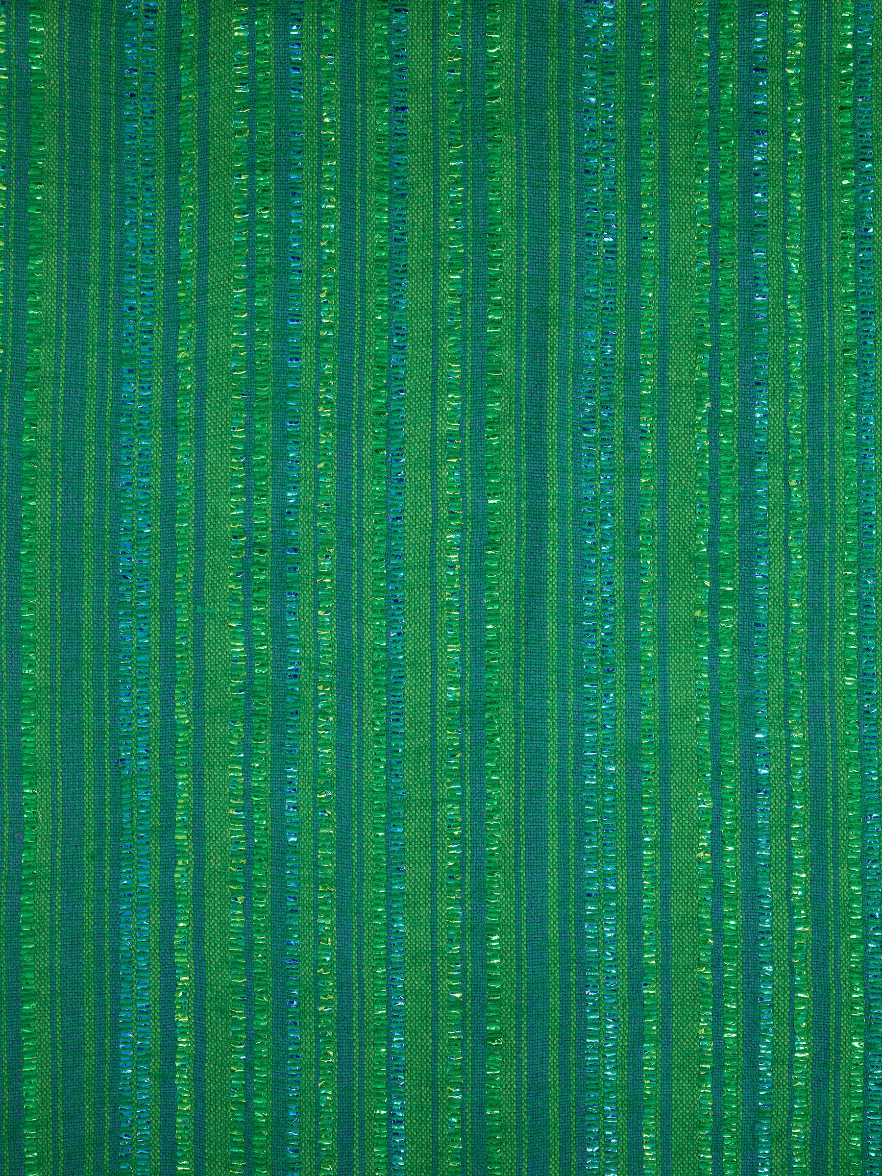 Under the gallery lights, Liebes’s textiles twinkle and glitter. Some pieces glow neon bright or radiate jewel tones. Others soothe the eye with muted pastels. Though the accompanying book can’t offer the same sensory experience of the real deal, it gets close. Enclosed in a dark green, cloth-covered case binding with an electric lime-colored serif font and aqua-teal end papers (a nod to Liebes’s penchant for analogous colors), a generous selection of lush, full-page close-ups display her weavings in tremendous detail. The photos exude such fibrous presence that it seems like you could actually feel the velvety chenilles, fluffy tufts, loopy fringes, crinkly plain weaves, smooth bamboo slats, translucent acrylic rods, and slubby twills.