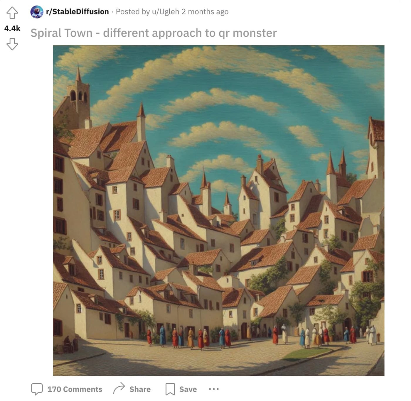 Ugleh used QR Monster to create "Spiral Town," but instead of inserting a QR code, he provided a spiral as the second prompt to incorporate into the image of the medieval town. QR Monster packaged the “make two images at the same time” functionality in a way that would make it easy for businesses to use it — but AI art enthusiasts took the tech and ran with it.