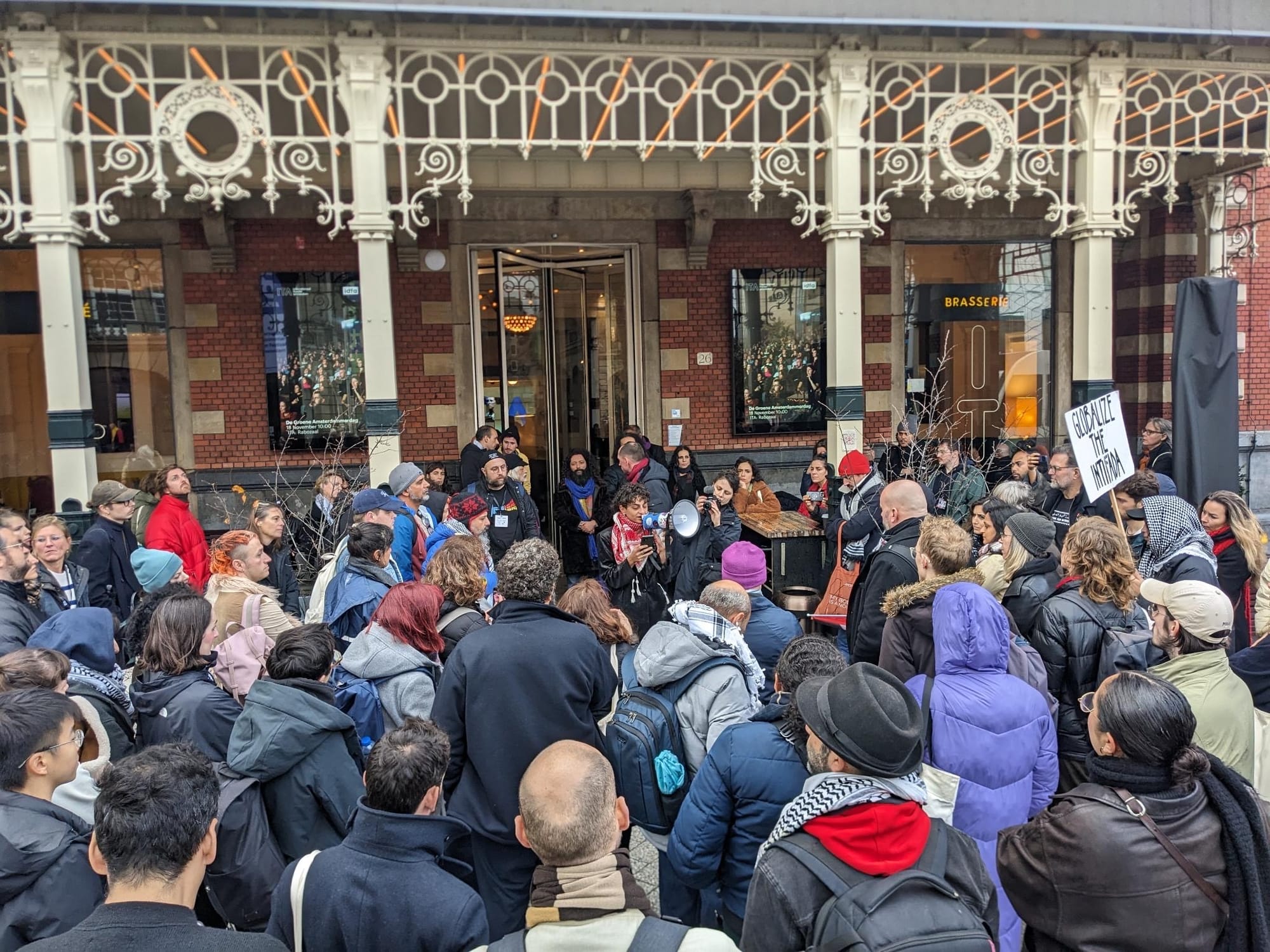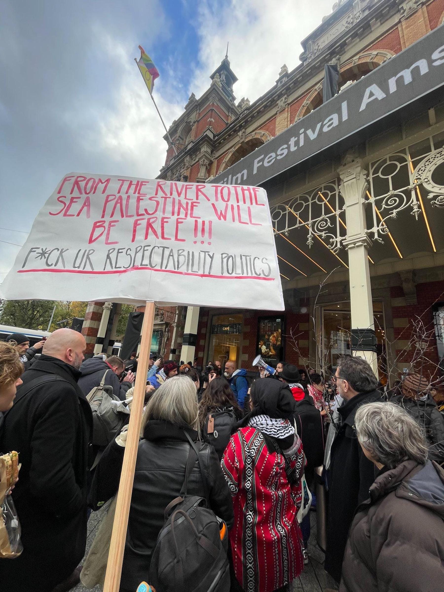 But representatives of the advocacy group Workers for Palestine Netherlands told Hyperallergic that they view the “neutrality” of the festival’s statement as a form of “complicity." This afternoon, November 13, members of the advocacy group joined PFI, filmmakers, cultural workers, and other dissidents outside Amsterdam’s Internationaal Theater to continue protesting the film festival.