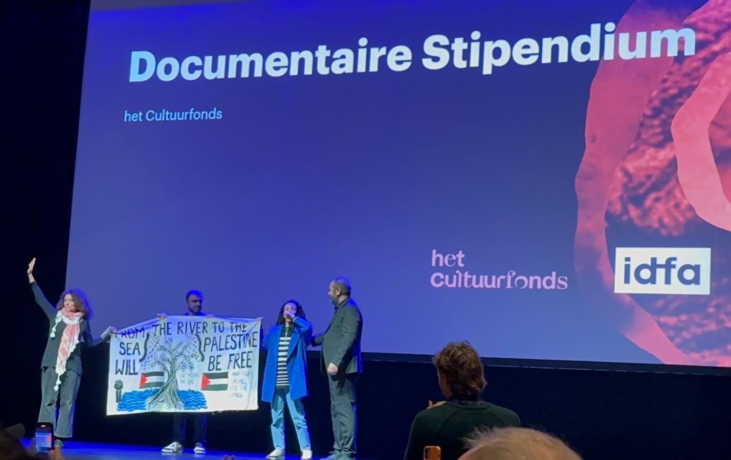 The controversy began on November 8, when three protesters displayed a banner with the Palestinian protest slogan “From the river to the sea, Palestine will be free” during a talk by the festival’s Artistic Director Orwa Nyrabia. Two days later, the IDFA and Nyrabia published a statement in response to the action apologizing to any festival goers who may have been affected by the banner’s “hurtful slogan” during the opening night action.