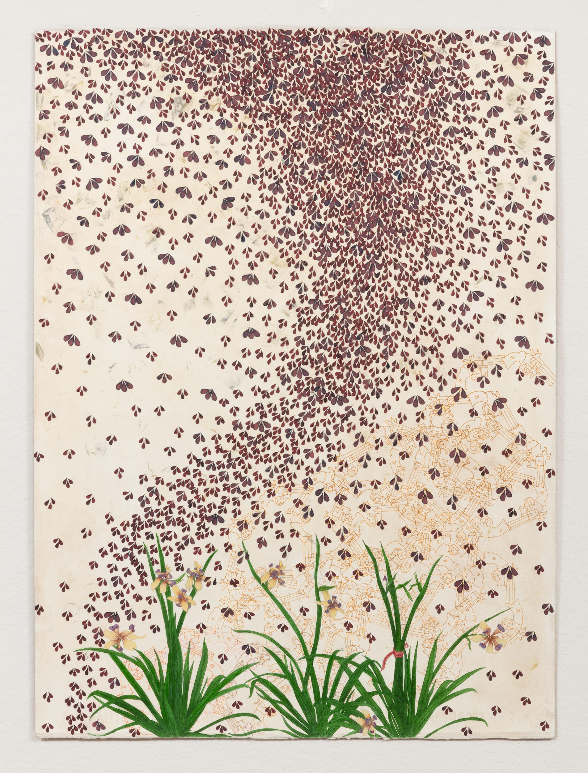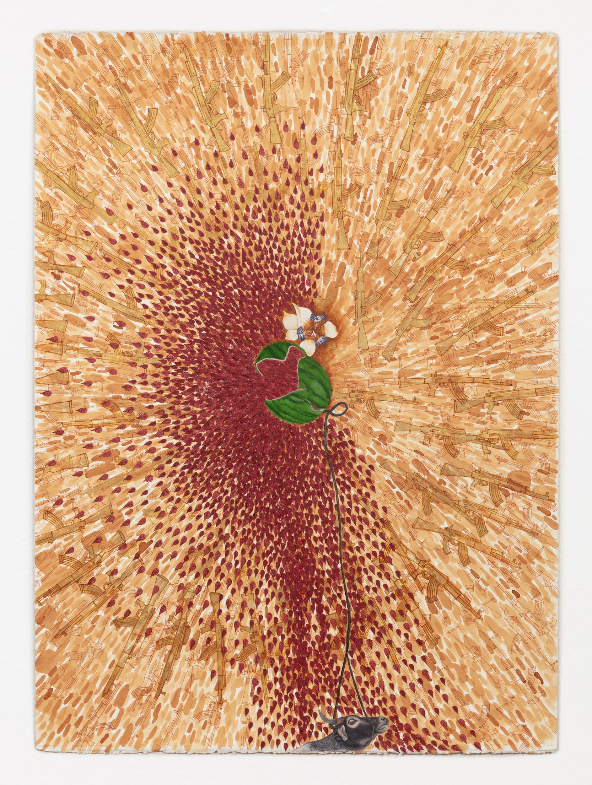 On the whole, the work in Lay Bare My Arms suggests manuscript illumination writ large, in a sacred language of guns, flowers, demons, petals, oxen, and insects that provide an intuitive exegesis for the viewer. But some of it is also expressed in plain English. Fragments of the Second Amendment appear again and again. In Butt’s work on view, the right to bear arms abuts the fragility of human flesh. Bearing arms meets bare arms, which might evoke the feminine, even the maternal babe in arms. In the collages with Urdu, the words include “children,” “future,” “people,” and “innocent.”