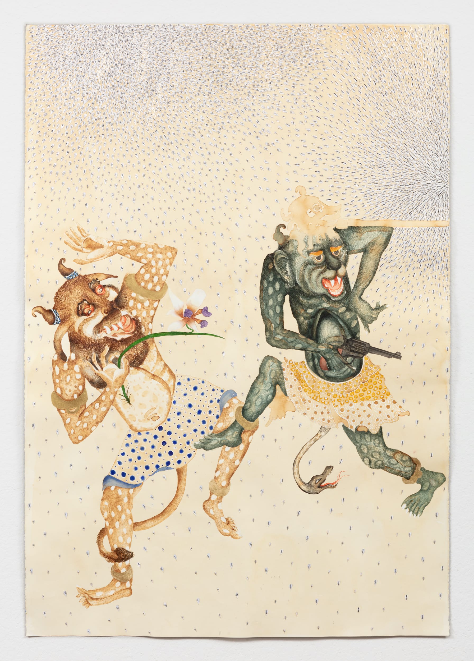 One of the first pieces in the show, “Arsenal of Ambiguity” (2023), is both scary and whimsical, featuring a hairy, bearded, and oddly sweet demon with flaming eyes, holding an automatic weapon in one hand and a fistful of irises in the other. Both guns and irises reappear throughout Lay Bare My Arms, juxtaposing life and death, beauty and danger. The demon runs or dances in a collaged field of falling blue flowers and wears a red-striped skirt tied with a blue sash at the waist. This is a demon either made in America (or Texas) or frolicking in its abundant fields. The center of many of the flowers have “Arms” written on them in English, while the petals says things like “security” and “free state” and “people.” Some writing is also in Urdu.