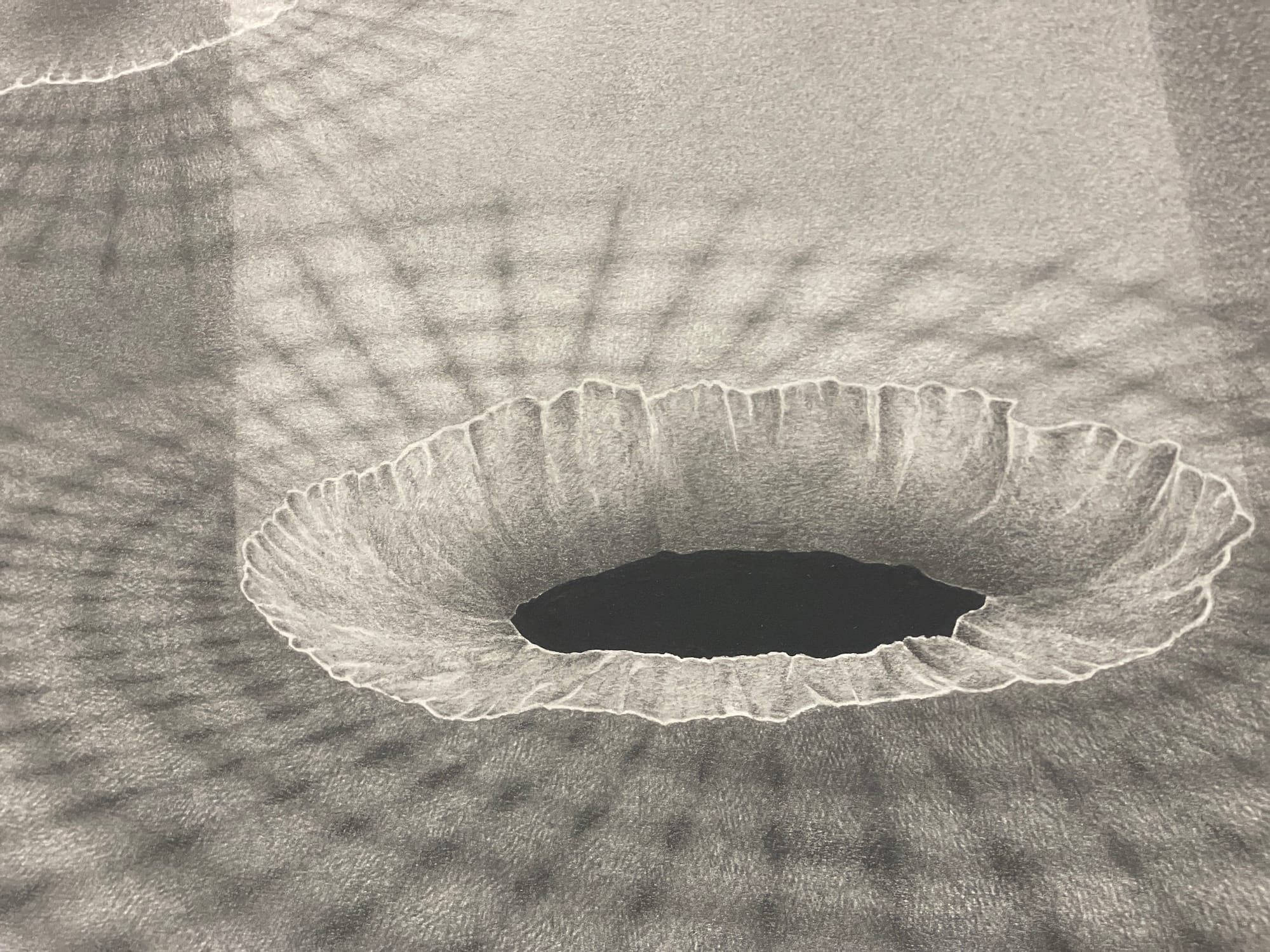 Adam Liam Rose, "Stages of Fallout (ever new)" (2022), graphite (photo Isabella Segalovich/Hyperallergic)