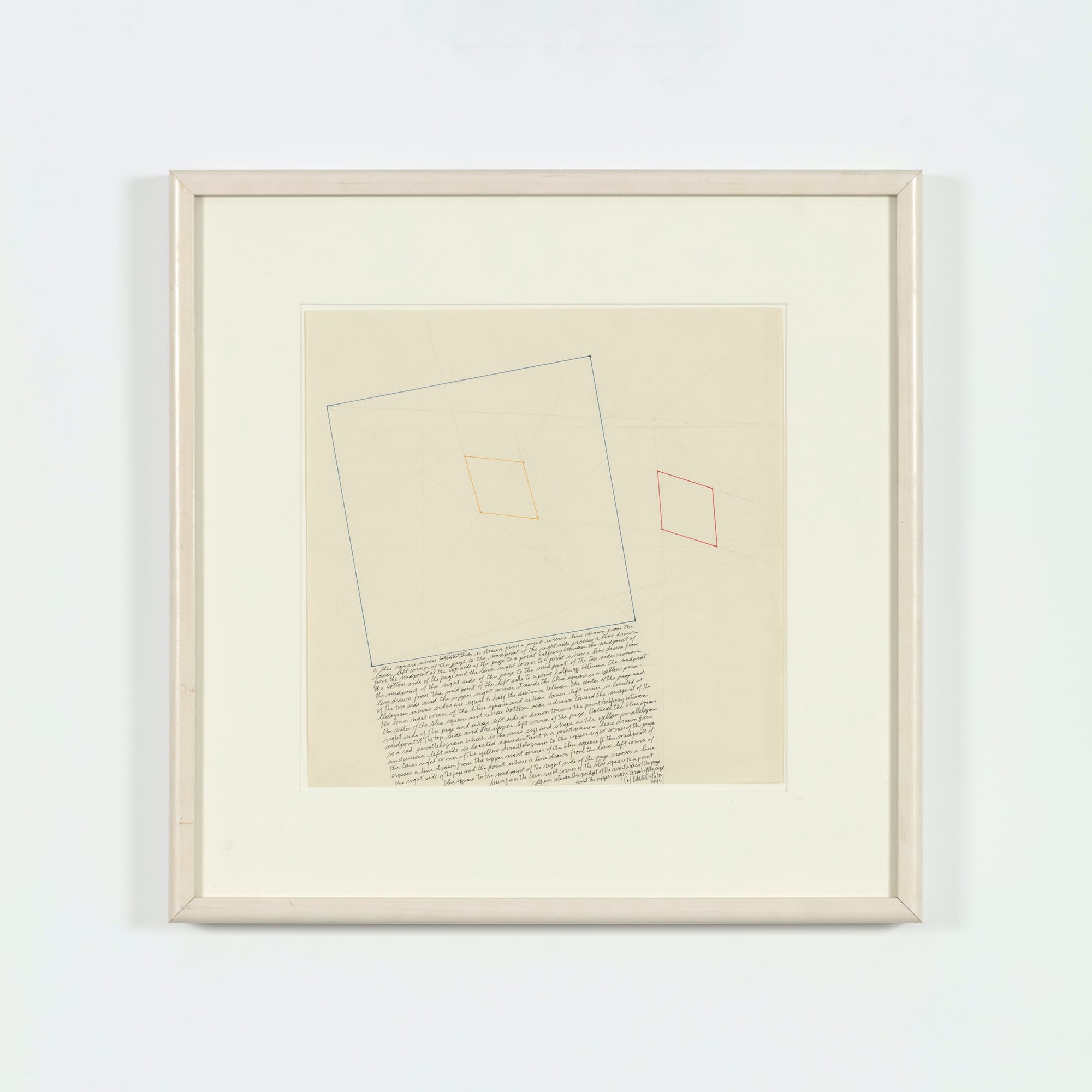 Sol LeWitt, "The Location of a Blue Square, a Red Parallelogram, and a Yellow Parallelogram" (1976), graphite and ink on paper, 12 1/2 x 12 1/2 inches (© 2023 The LeWitt Estate / ArtistsRights Society (ARS), New York; courtesy Paula Cooper Gallery, New York; permission for use by the National Academy of Design)