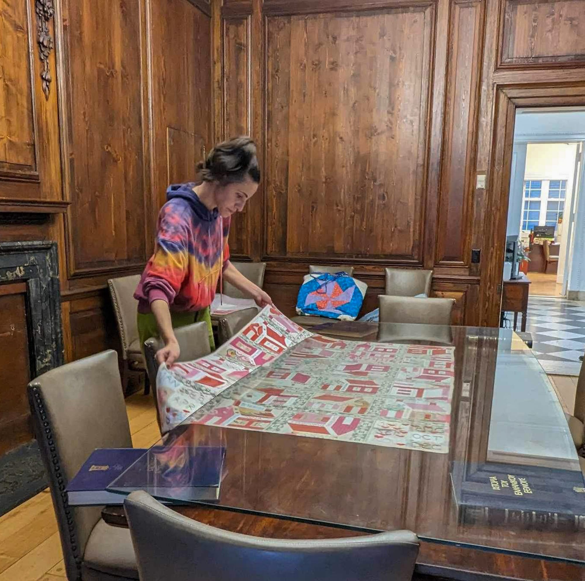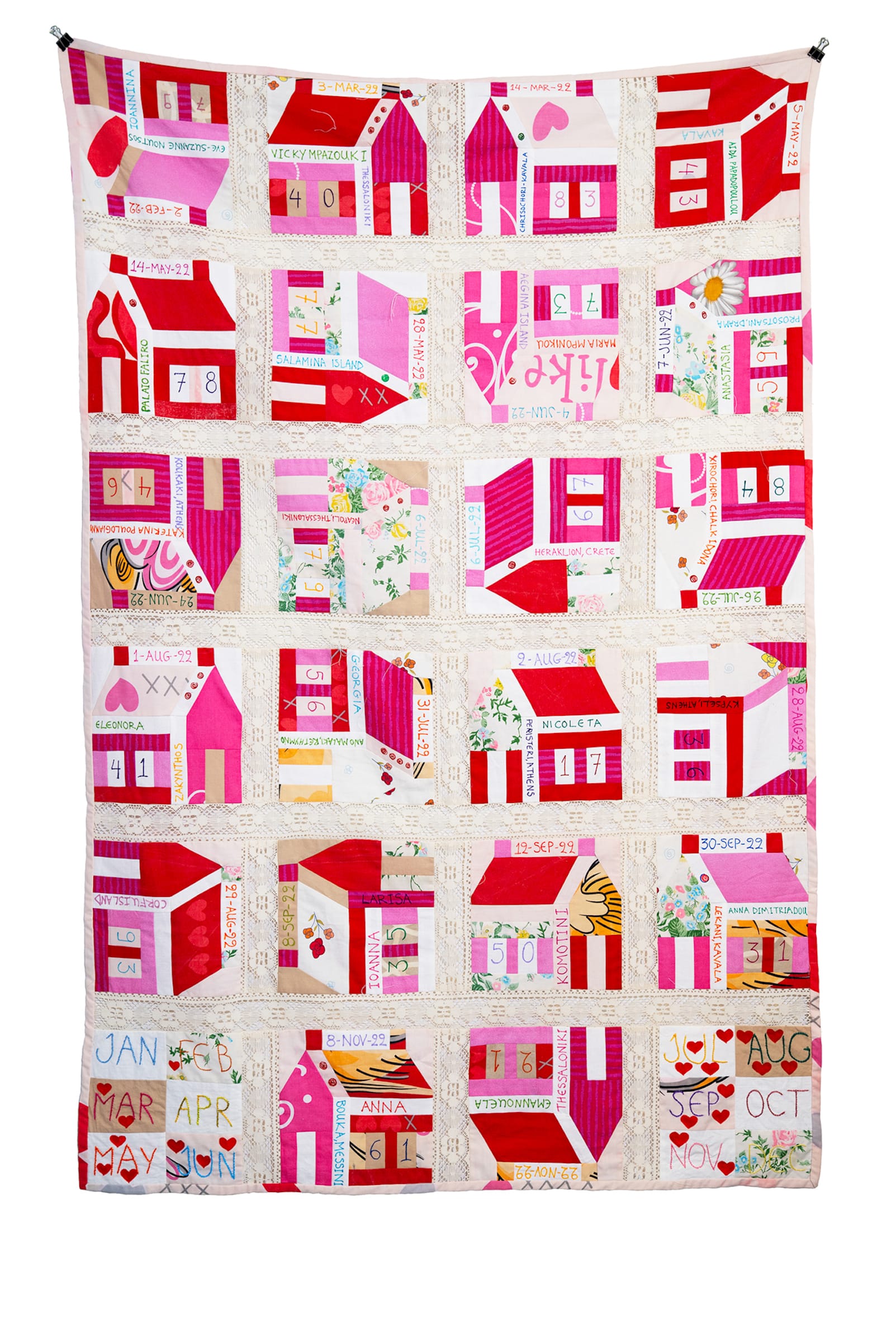 For "Neighborhood Guilt" (2023), the artist created a nearly six-foot long quilt featuring 22 patchwork pink and red houses, each dedicated to a femicide victim who was killed in Greece 2022.