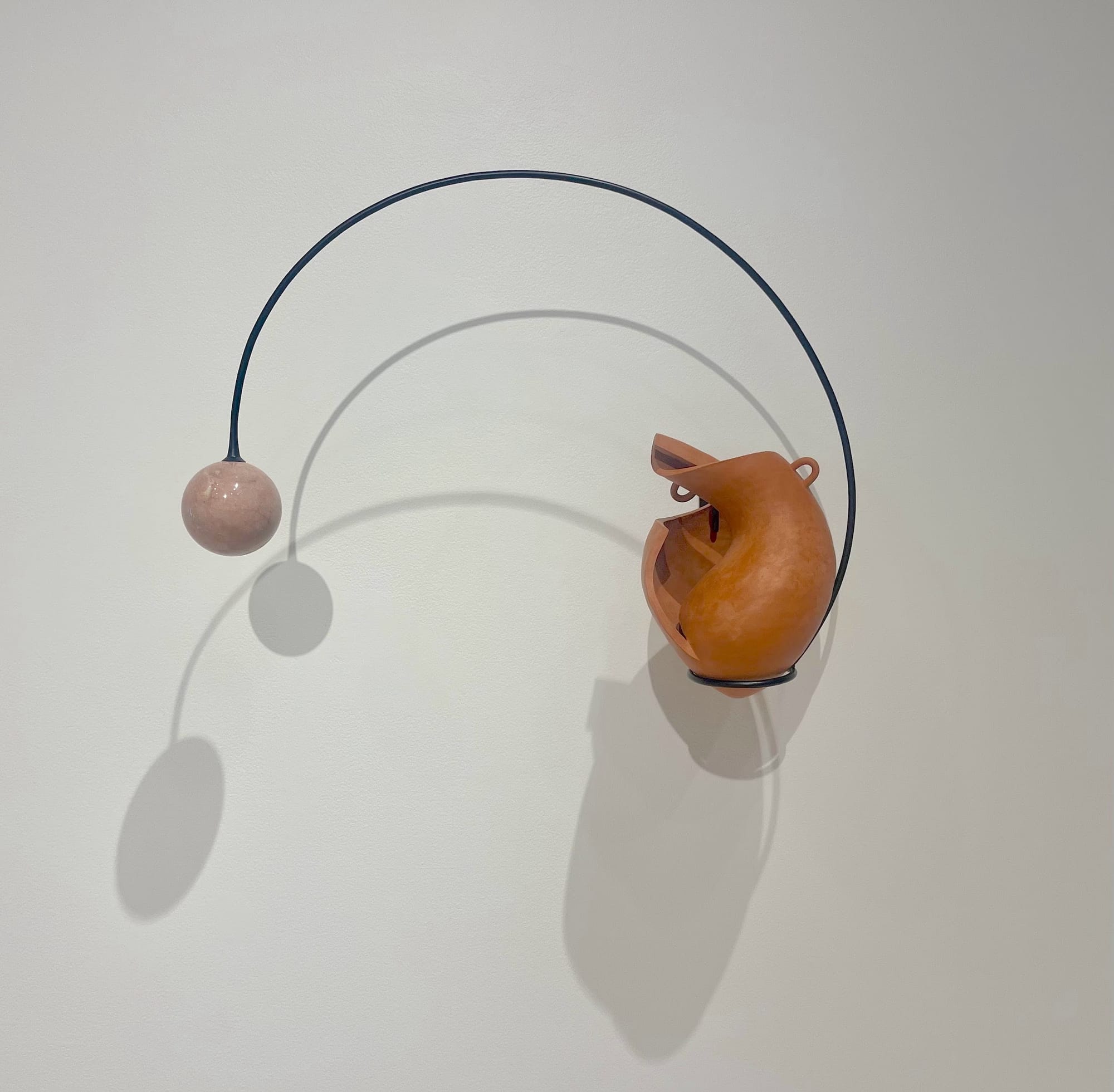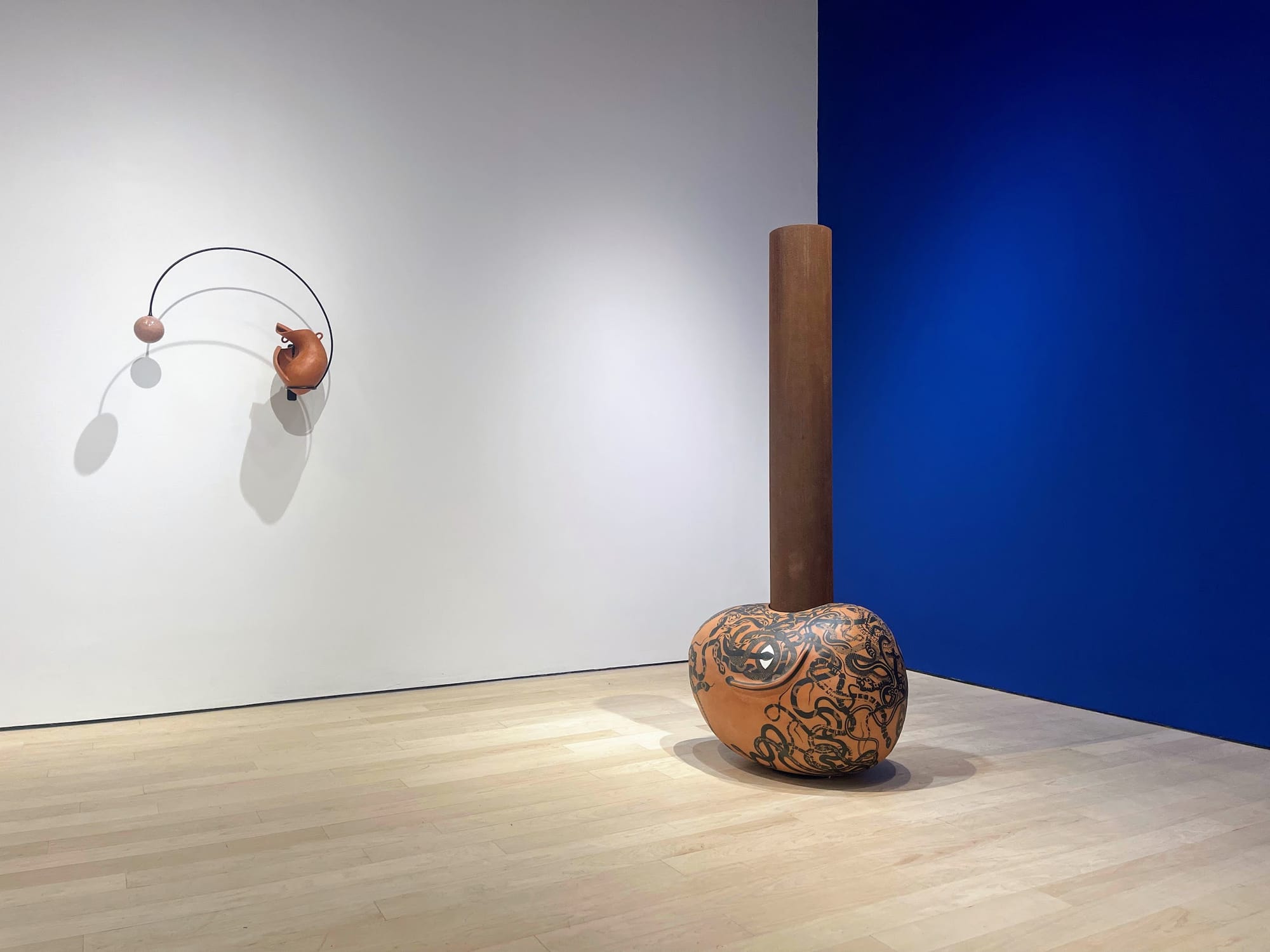Staros’s multimedia works, which range from wall-hung installations to freestanding sculptures to pottery sunk into aquariums, refer to a style of Classic ceramics — typically black-figure narrative amphora (vase) or kylix (wine cup). They also emphasize the bodily associations long ascribed to them; while she eschews traditional figurative illustration, every piece in Unearthing the Sky evokes the human (nearly always female) form, highlighting the tangled, often dangerous ways our society imagines women as receptacles — of desire, shame, beauty standards, and of course sex and motherhood.