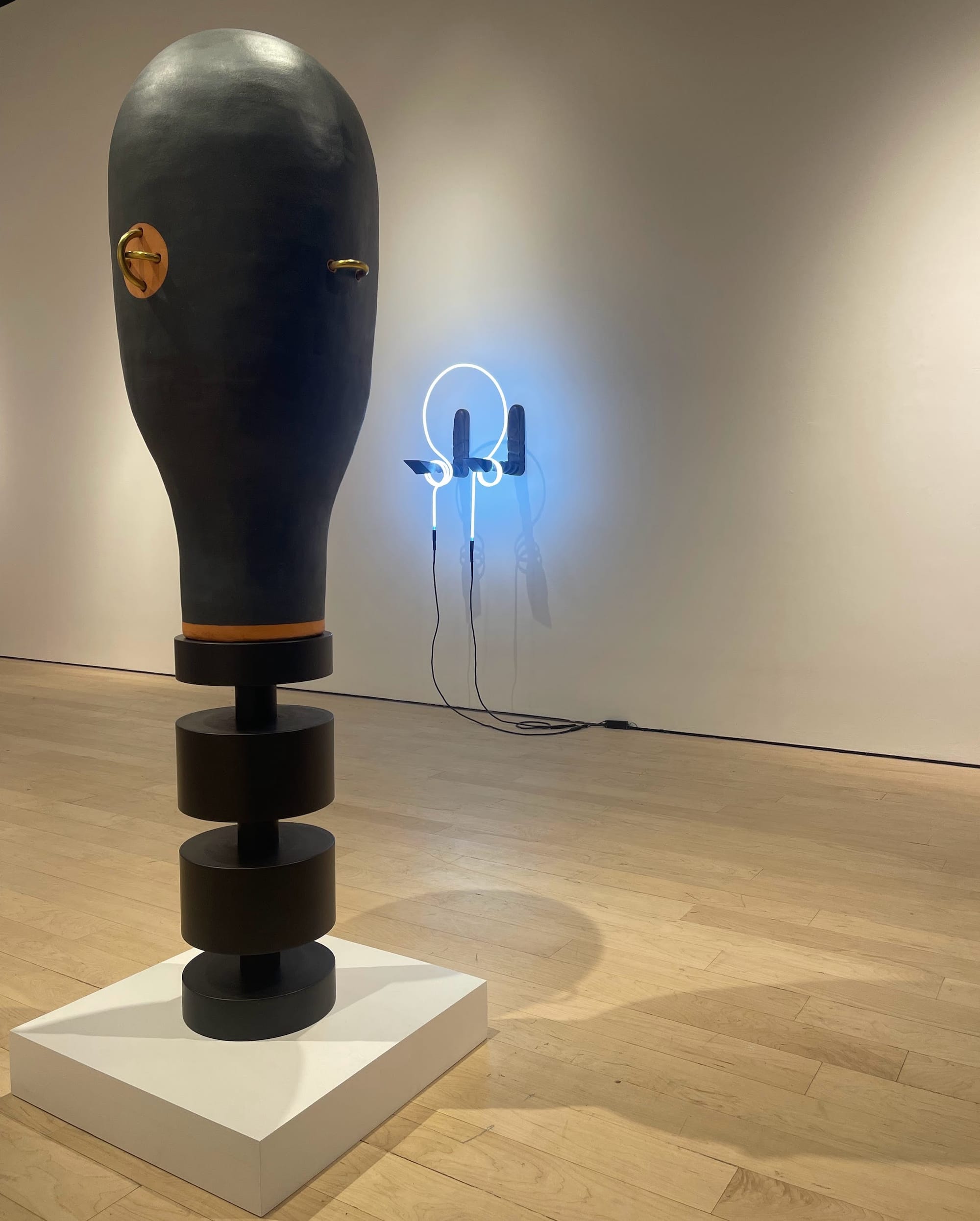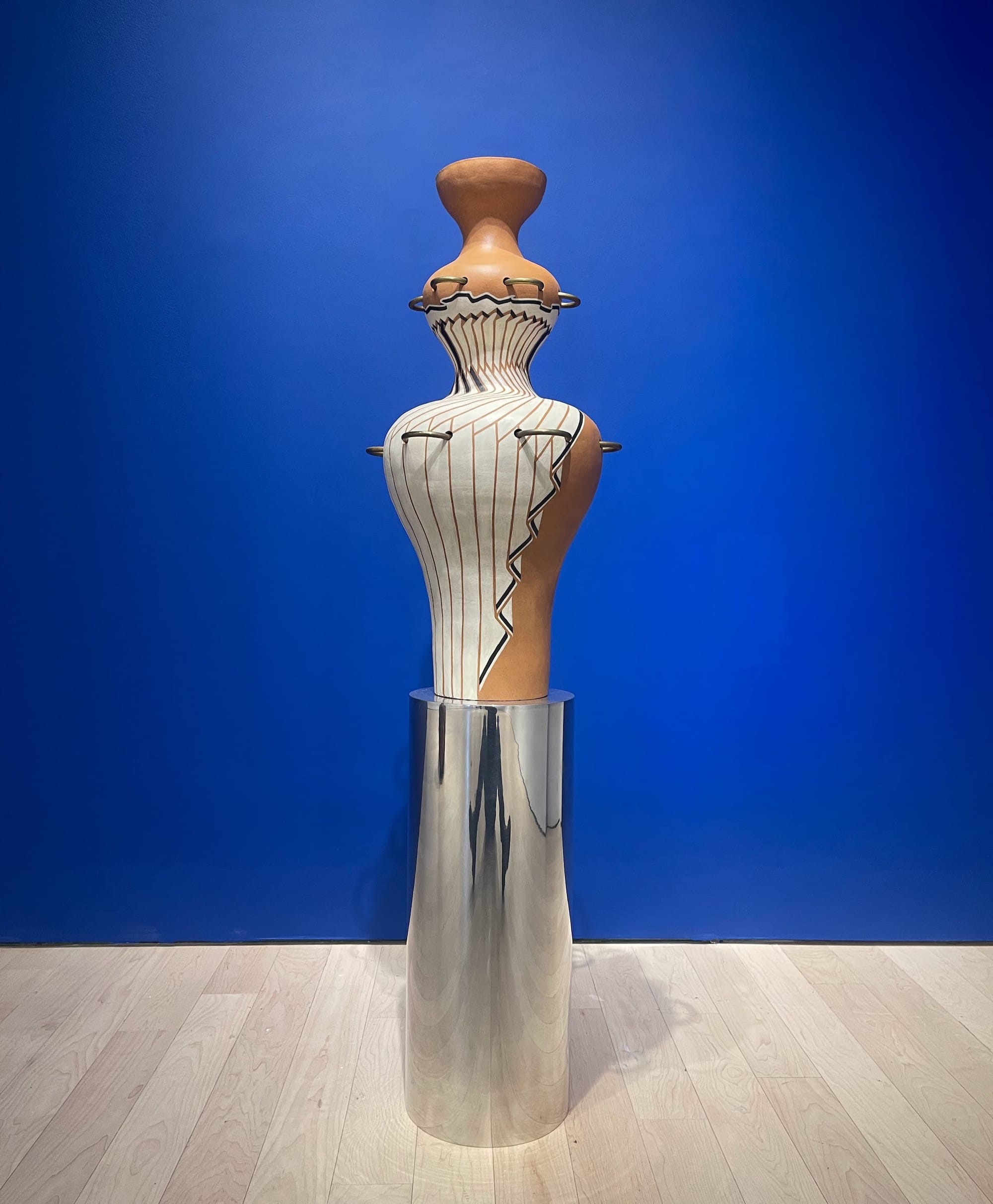 Two large freestanding sculptures, “How Neat the Fold of Time” (2017) and “My Soliloquy to Your Chorus” (2017), depict this overt sexualization. The former displays the hourglass curves and wasp waist of Jessica Rabbit, its traditional pattern zigzagging along its form like a thigh-slit dress, and the latter rises up as a great masked head, its unremitting, soft blackness recalling a leather bondage hood. Both pieces are pierced with brass rings, which — coupled with the allusions to fetishization and constraint — denote how both pain and pleasure play into these long-inherited beauty ideals.