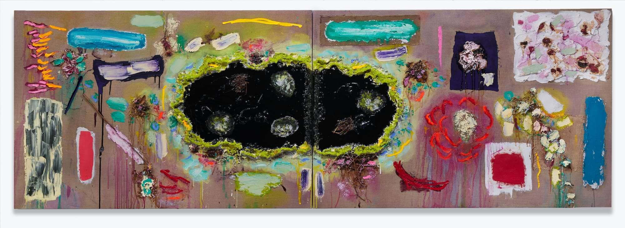 Snyder has always been a maximalist, but her mastery of a potentially chaotic vocabulary is impressive, her control over randomness everywhere evident. Two adjacent canvases form a long rectangle in “Pond Dreaming,” so titled for a deep black oval that straddles the central break. It is ringed by a wavy green-and-yellow ribbon of paint squeezed from the tube, and beyond that, a subtle stained penumbra that creates a magical glow. The pond, reflecting perhaps a few distorted moons, suggests a nighttime view. Is the scattering of images surrounding it the “dream”? The horizontal dashes and strokes that first brought Snyder fame in the 1970s are here decisively rendered in crusts of color. To the right are a fluorescent-pink rose — ever her favored flower — and three vignettes that could almost be miniature Snyder paintings hanging on a wall. Drizzles of paint lend vertical ballast to an overall horizontal read and, above the pond, a long strand of bright yellow paint twists back on itself like the flourish in a signature.