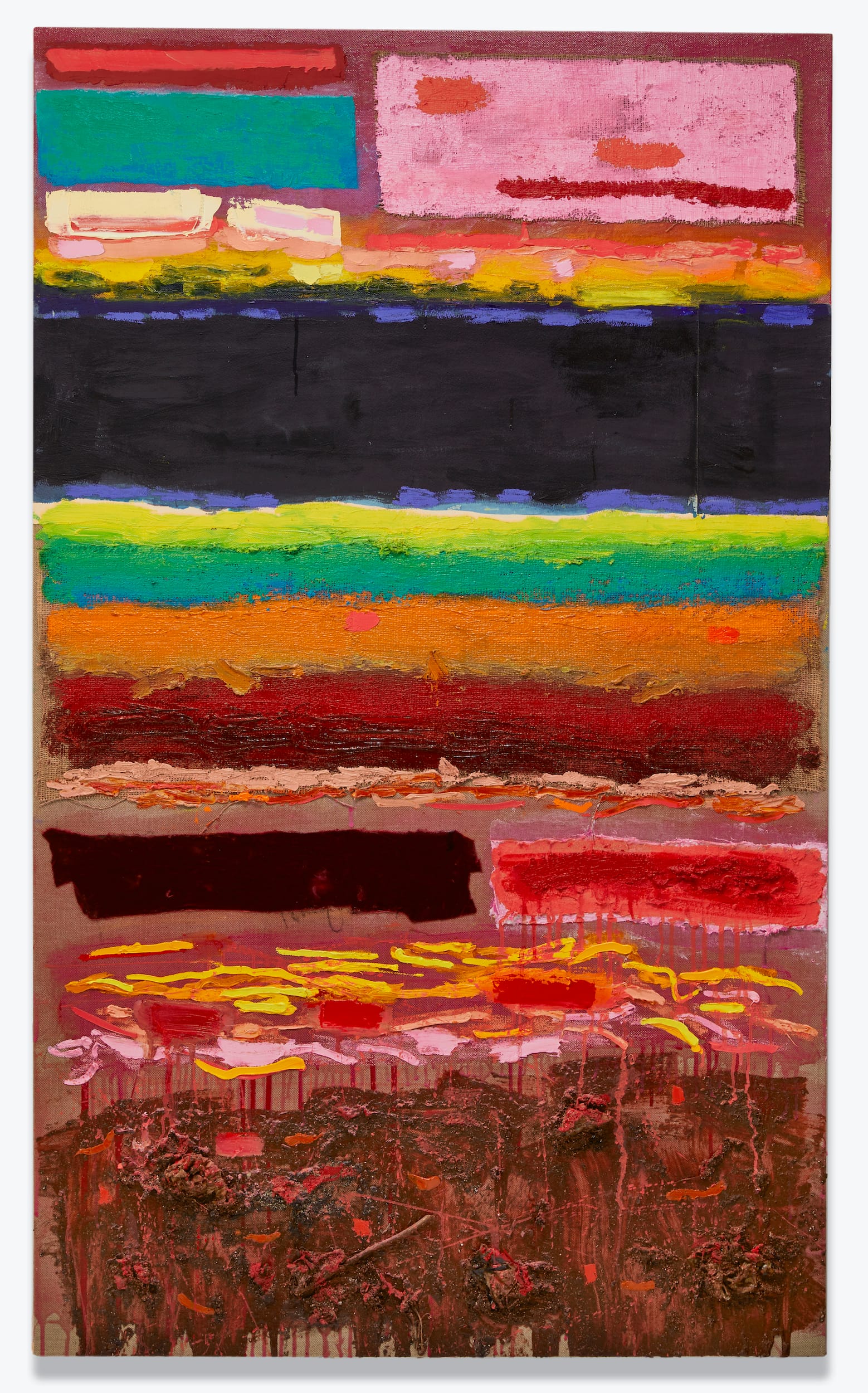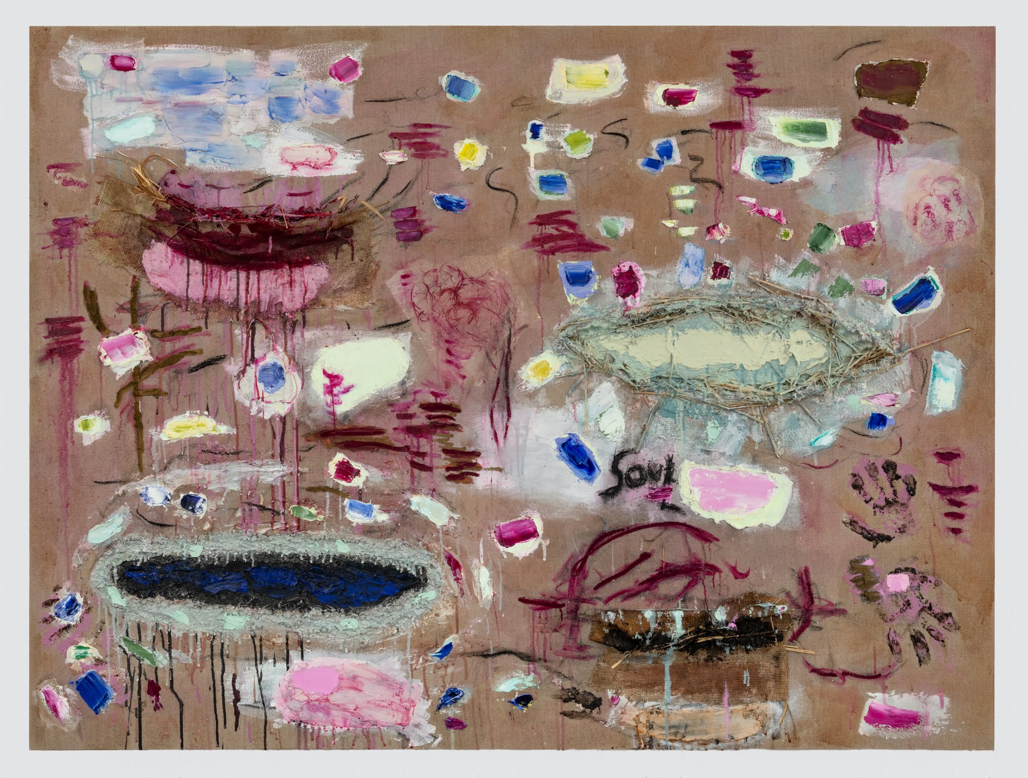 Everywhere we are made aware of a passion for nature that is deeply personal. Twigs and straw are never marshaled to the grandiose, as in Anselm Kiefer. “The heart is a fistful of earth” Snyder wrote in a painting many years ago. Her materials are trapped in the boat-like fissures floating through soul catchers, along with primeval handprints and the word “Soul.” Paint-covered earth, dried flowers, and twigs congeal at the bottom of “Red Velvet Vertical,” while above rise layers of deliberately painted bands ranging from deep red through rainbow hues to black, toward a kind of second horizon with yet more colored bands above. The painting suggests a constant, self-examining practice, one that, 20 years after her printed declaration, remains “absolutely faithful” to the veteran who wields it.