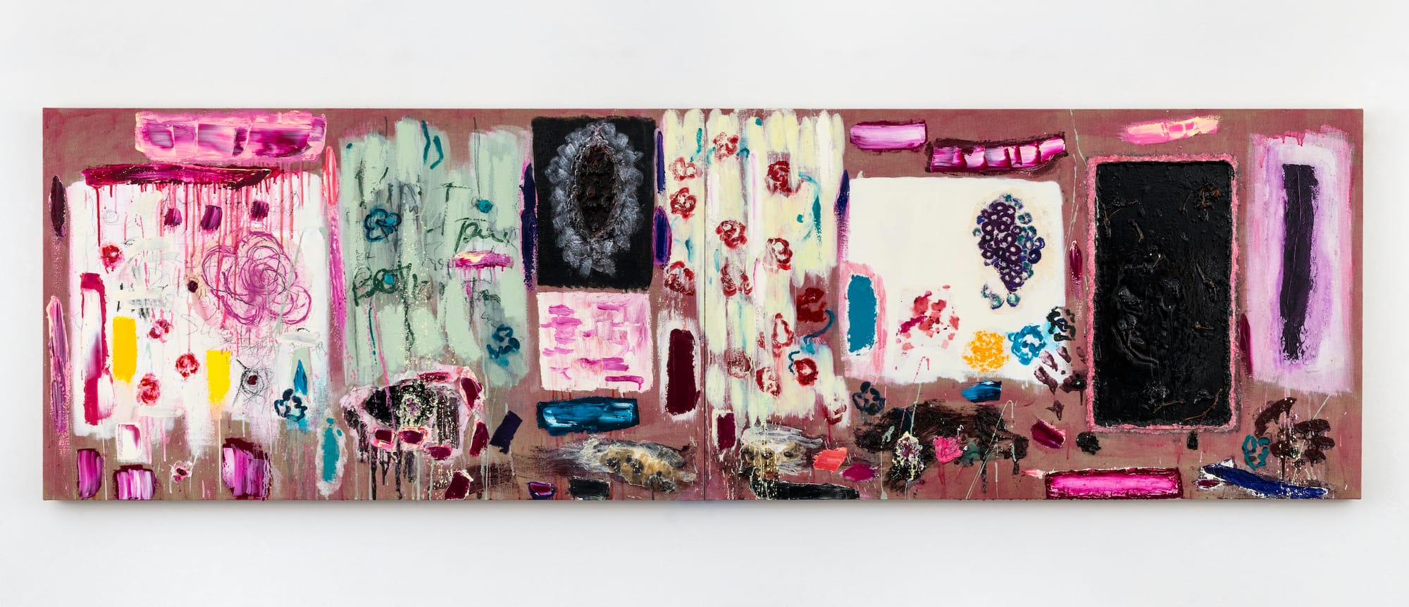 Some paintings feel almost like samplers: “Grounding,” for example, with its three registers of inset rectangles containing mini fields of flowers, strokes, and fallen fruit. Or the less serene “Only in April,” with its blotchier versions of Snyder motifs, scumbled and bleary, as if dissolving on the walls of her studio. At the top is a somber wreath, reminding us that April, in Snyder’s paintings, has signified a time of crisis and mourning. Here the choppier bits seem to have sunk to the bottom of the painting, darkening the mood. Throughout the show, the frequent use of pink continues the artist’s insistence on a defiant femininity, as in the curvaceous pond at the center of “Magenta & Bronze.” Look closely within the ambient pink of “Sub Rosa II” and you will find a scrawled naked woman, as on a bathroom wall. For Snyder, painting and sexuality are closely linked.