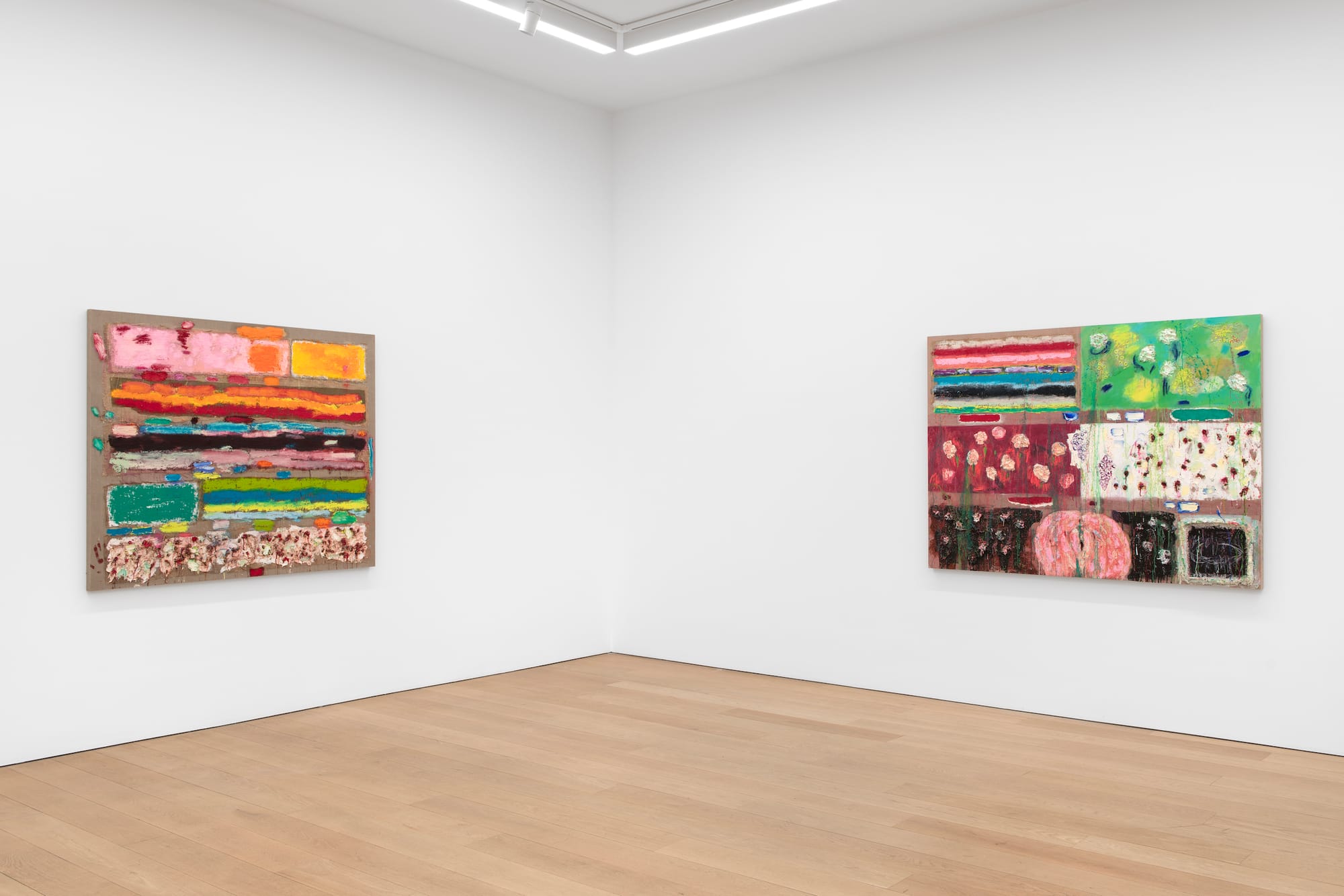 “MY WORK HAS BEEN ABSOLUTELY FAITHFUL TO ME,” reads an emphatic text in a 1997 print by Joan Snyder. It might be a banner, as well, for ComeClose, her exhibition of 13 recent mixed-medium paintings reiterating motifs and materials she has explored for over half a century. Nearly every Snyder riff is sampled: thick, churned-up impasto, roughly shaped burlap, collaged seedpods, dried rosebuds and twigs. Among the motifs are colored strokes, fallen cherries, grapes, pods, roses, fields, and shapes suggesting bodies, ponds, moons. Nature, mortality, sexual passion — themes that have recurred throughout her career — are present, but it is her sure-handedness that dazzles above all.