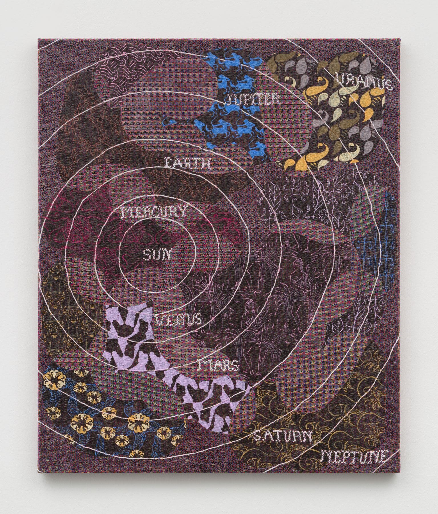 Pieces in this area incorporate the “mythologies” and “systems” referenced by the exhibition title. A series of 12 gouache-on-paper paintings place illustrations of Zodiac signs into repeating grid patterns. These symbols peek through the textile painting “Eccoci” (2022), Italian for “here we are,” which is overlaid with a chart of the Copernican solar system. “Fire of the Jaguar” (2023) is based on the Amazonian Kayapo tribe’s legend of humans acquiring fire from jaguars. Its crawling feline figure is embellished with painted and embroidered patterns derived from diagrams by anthropologist Terrence Turner. “The Universe” (2023) and “Shapes in Time” (2022) are complex compositions that require close inspection to appreciate: The former combines many of the aforementioned patterns with numeric codes, while the latter references root directories in computer science as well as the numbered shafts and pedals of an eight-harness floor loom.