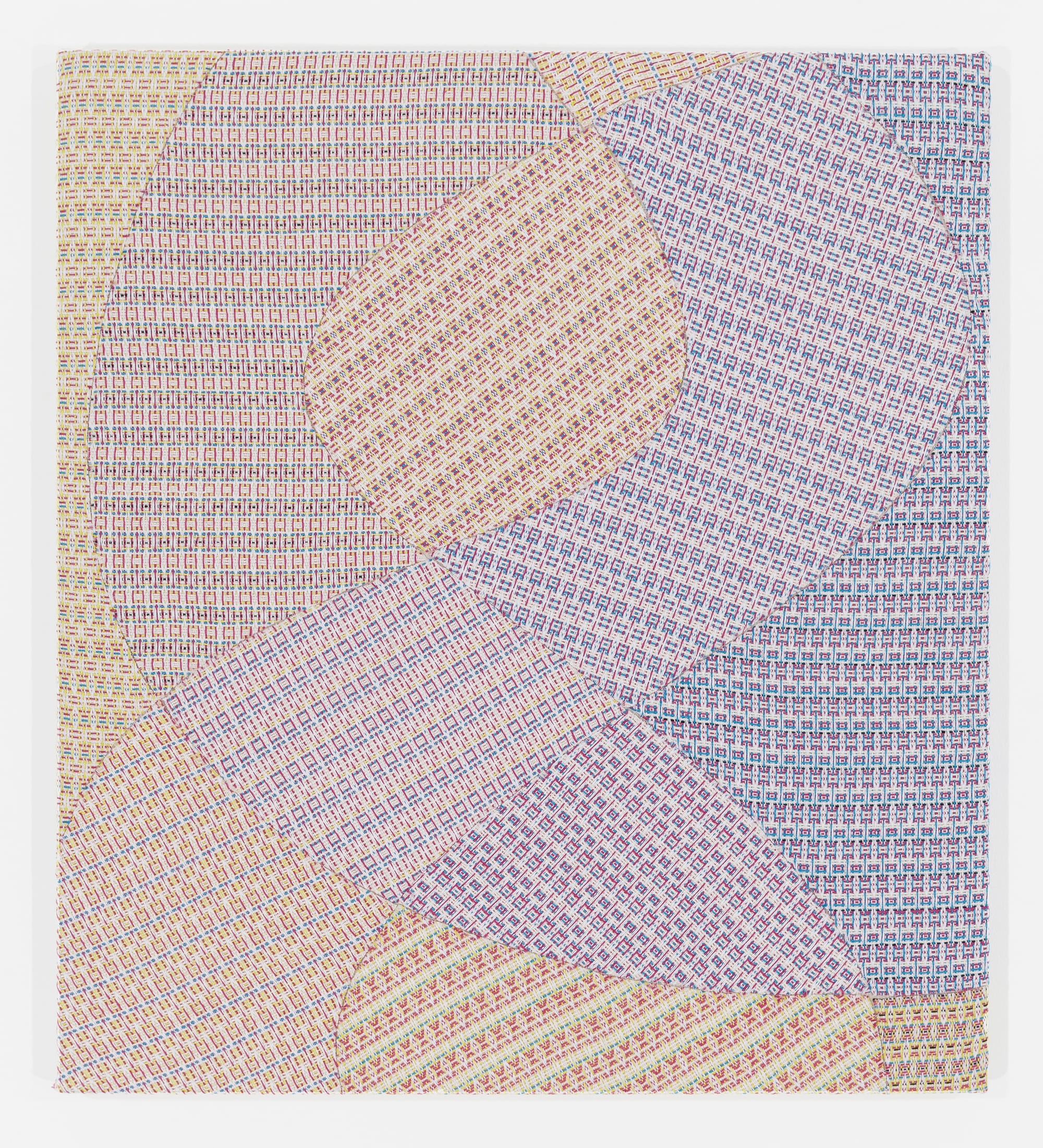 Currently on view at the University Art Museum at the State University of New York (SUNY) at Albany, Barrow Parke: Systems and Mythologies functions as an early career retrospective. The exhibition illuminates the 15-year evolution of the pair’s collaboration, from the geometric compositions Barrow meticulously painted on individual threads of Parke’s hand-loomed twills in the 2010s to the pair’s current maximalist mixed-media pieces.